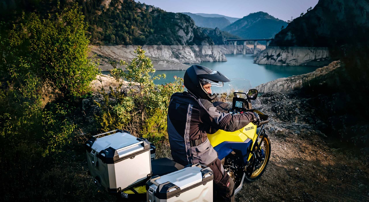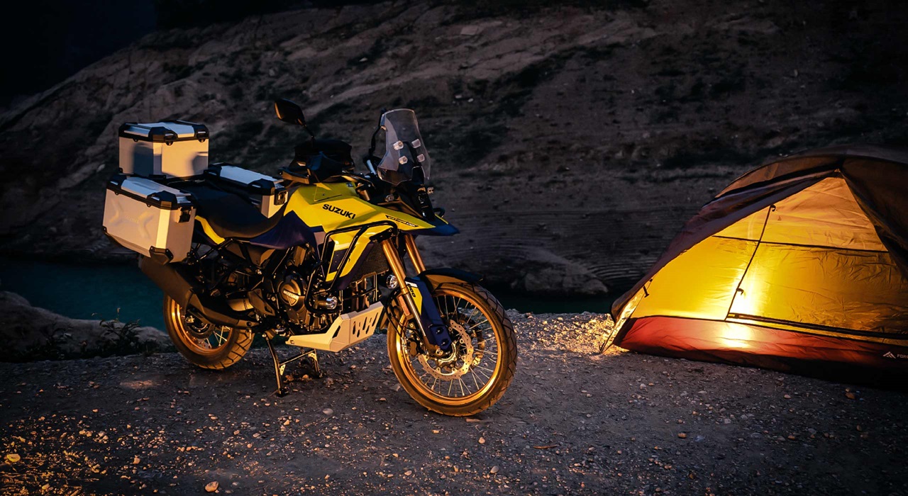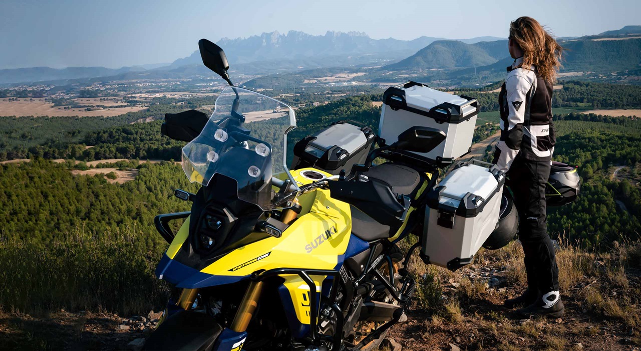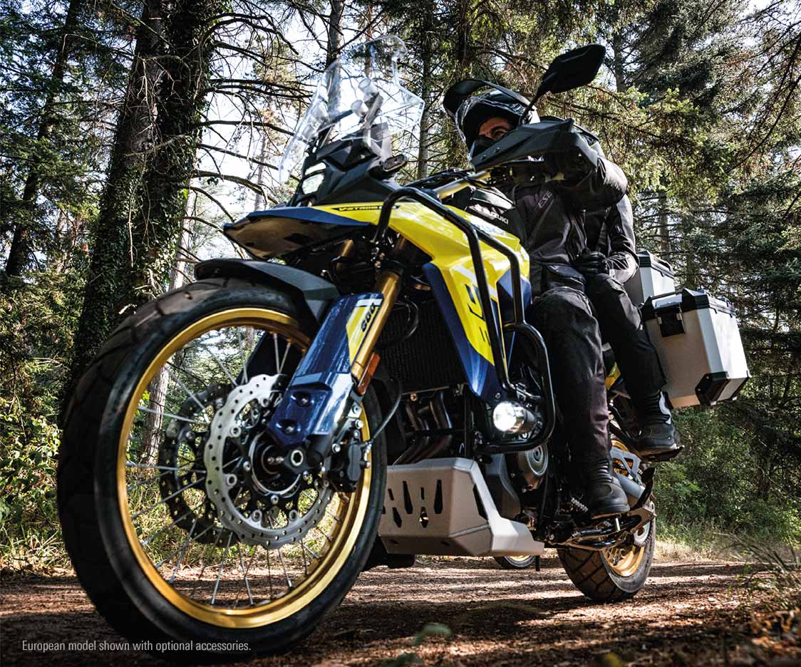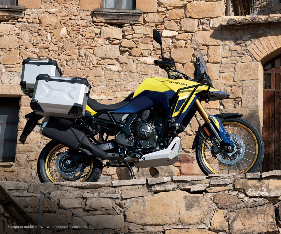 Included are Suzuki’s ADV-style, 37-liter aluminum panniers that attach to powder-coated, stainless-steel carriers.