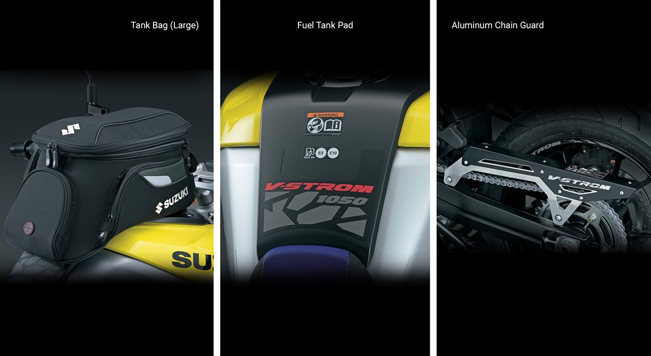 A wide variety of Genuine Suzuki Accessories for V-STROM 1050DE Adventure owners are available, including plastic luggage, heated grips, low-profile seats, accessory bar, tank bags, body & chassis protectors, graphics kits & rim decals, and a wide selection of Suzuki logo apparel.