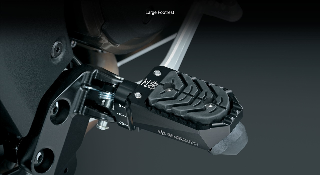Wide, steel footrests help the rider comfortably maneuver the V-STROM 1050DE Adventure on diverse types of roads. Rubber inserts damp vibration but can be removed so the rider’s boots can have even more grip of the pegs.