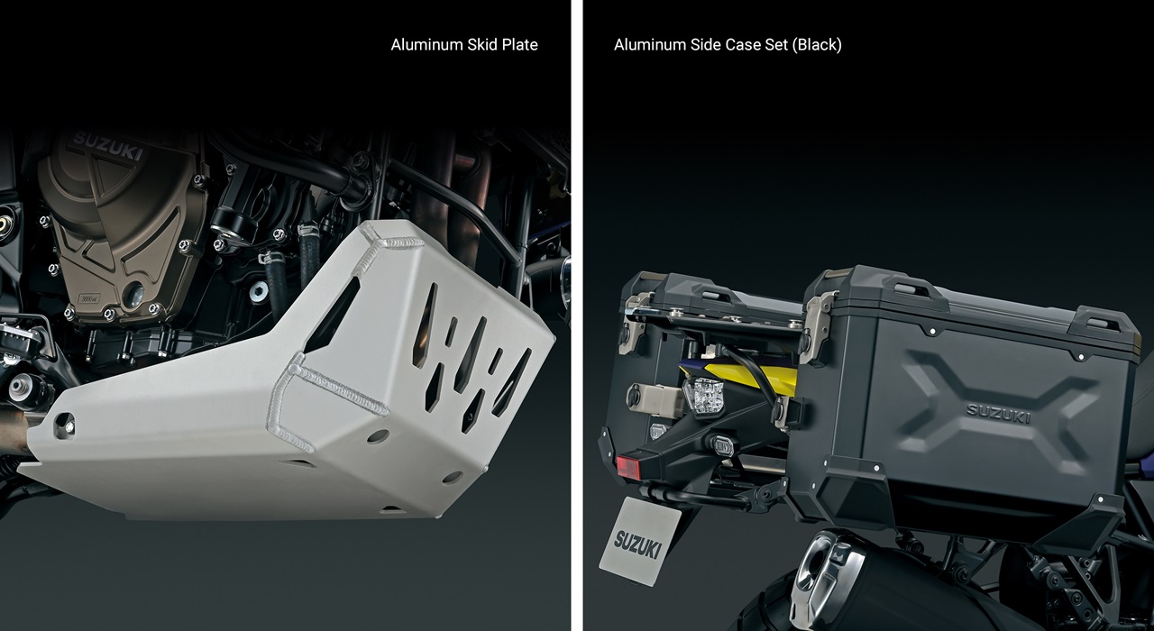 Genuine Suzuki Accessories for the V-STROM 800DE include side and top cases, engine guards, center stand, low- and high-profile seats, heated hand grips, fog lamps, and more.