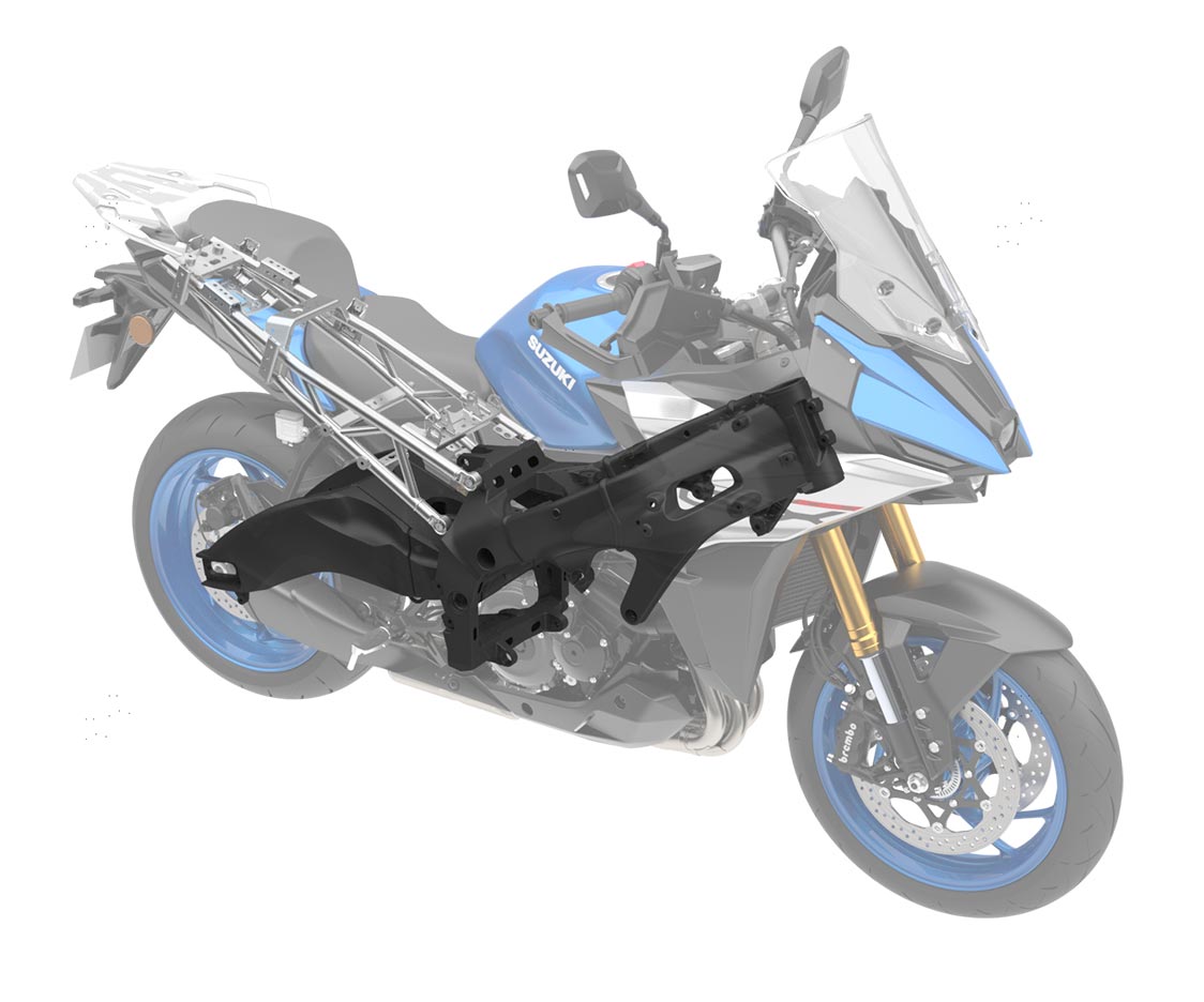Suzuki’s proven, twin-spar aluminum frame helps to ensure nimble handling and great road-holding ability. The GX+'s unique sub-frame design provides several benefits. It provides strong and secure attachment points for the side cases. Secondly, the short distance between the upper and lower rails makes it possible to increase the thickness of the rear seat for greater passenger comfort. Additionally, the exposed trellis design adds to the GSX-S1000GX+’s striking looks.