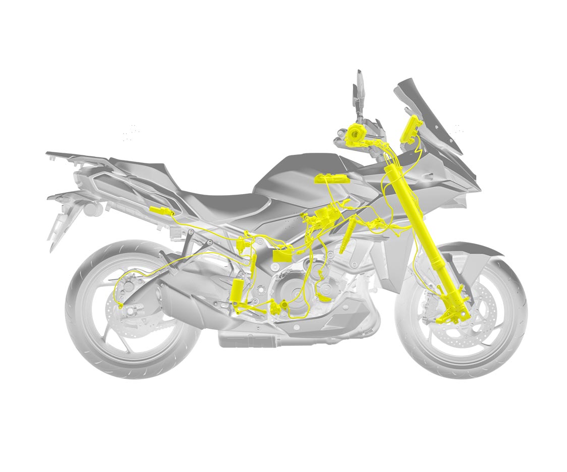 The GSX-S1000GX+ is a formidable Luxury Crossover model that combines the advantages of a long-stroke suspension with the benefits of electronic suspension performance. The Suzuki Advanced Electronic Suspension (SAES) uses vehicle and speed information from the IMU and wheel speed sensors, plus information from high-precision stroke sensors compactly integrated into both the front and rear suspension to instantly determine optimal damping.