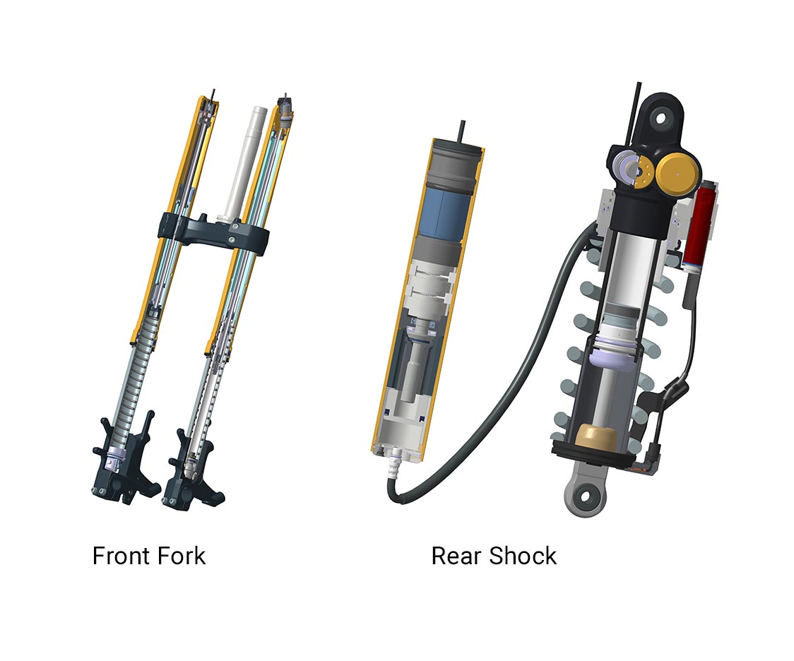 Suspension FrontInverted telescopic, coil spring, oil damped with remote, electronically controlled tuning