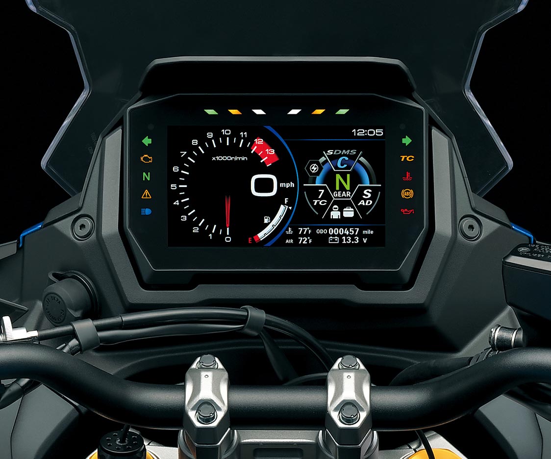 The GSX-S1000GX+ instrument panel employs a 6.5-inch full-color TFT LCD display designed to be easy to see and understand, and to provide the rider with instant access to the desired information.