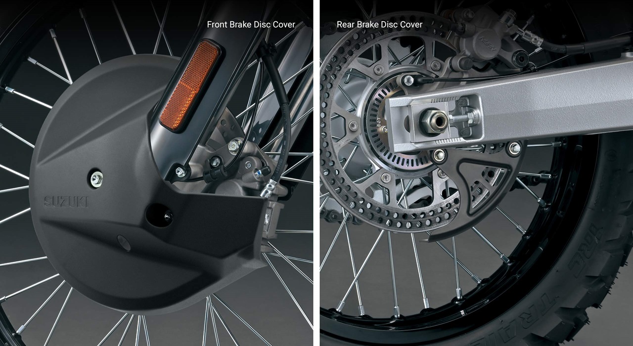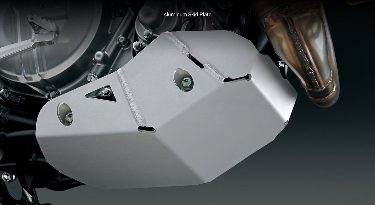 The aluminum under cover is standard equipment that help protects the bottom of the engine and matches the model’s rugged, off-road image. Suzuki Genuine Accessories offers a larger, thick aluminum skid plate that offers additional protection for the bottom of the engine and frame when riding on rough terrain.