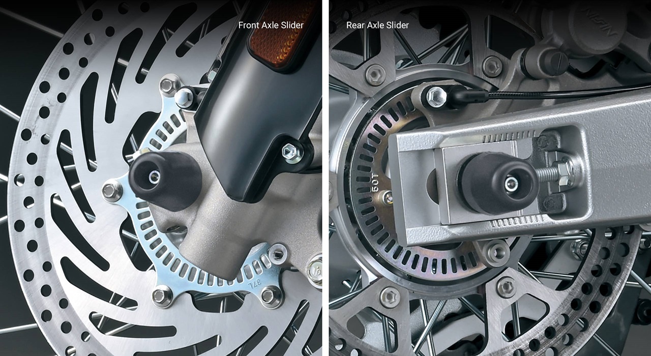 New slim exhaust system has large-diameter, stainless steel head- and mid-pipes, plus a double wall silencer design to reduce heat transfer to the rider or passenger.