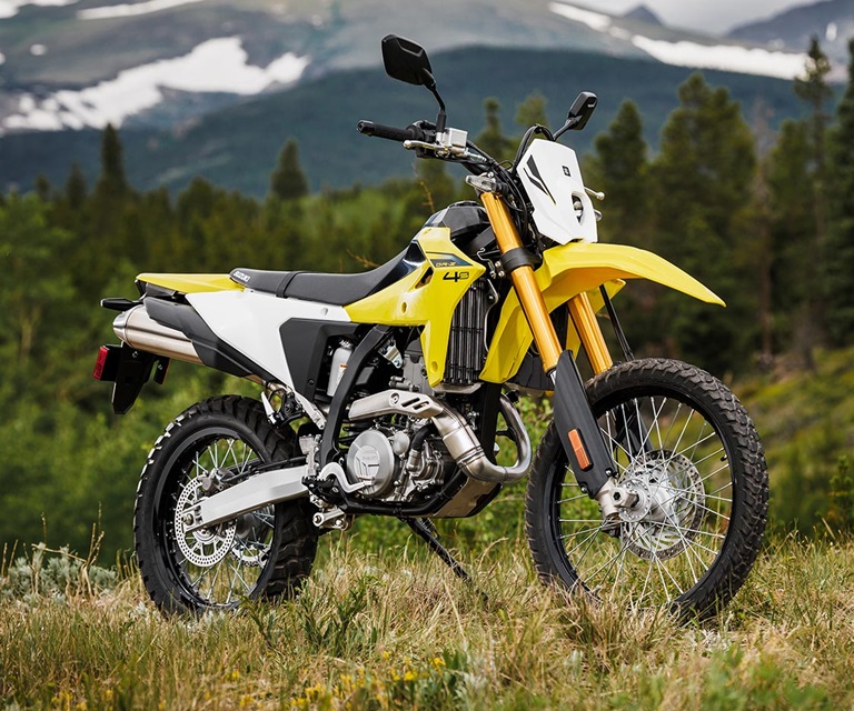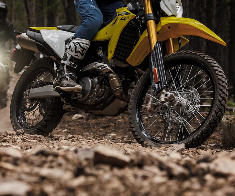 Minimalistic and sleek, styling visually confirms that the DR-Z4S is an extremely capable off-road motorcycle. Riders can choose the iconic Champion Yellow No. 2 / Solid Special White No. 2 bodywork or the stealth-like Solid Iron Gray plastics that blend well with the many blacked-out chassis components.