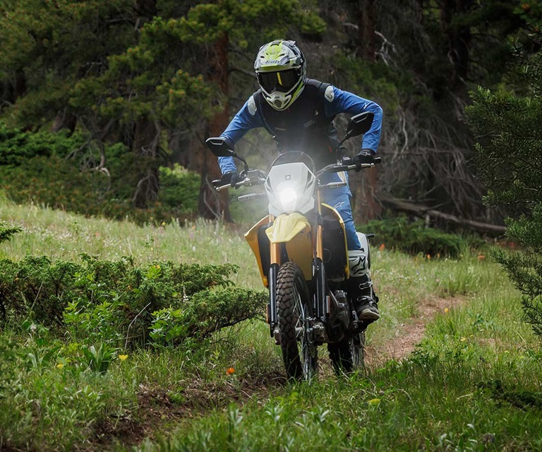 All of the DR-Z4S’ lighting is new, low-draw LED type, including the turn signals (white lenses with amber illumination), the taillight, and license plate illumination light. The new bifunction LED headlight is a unique design that incorporates both the high- and low-beam functions into one, bright projector module