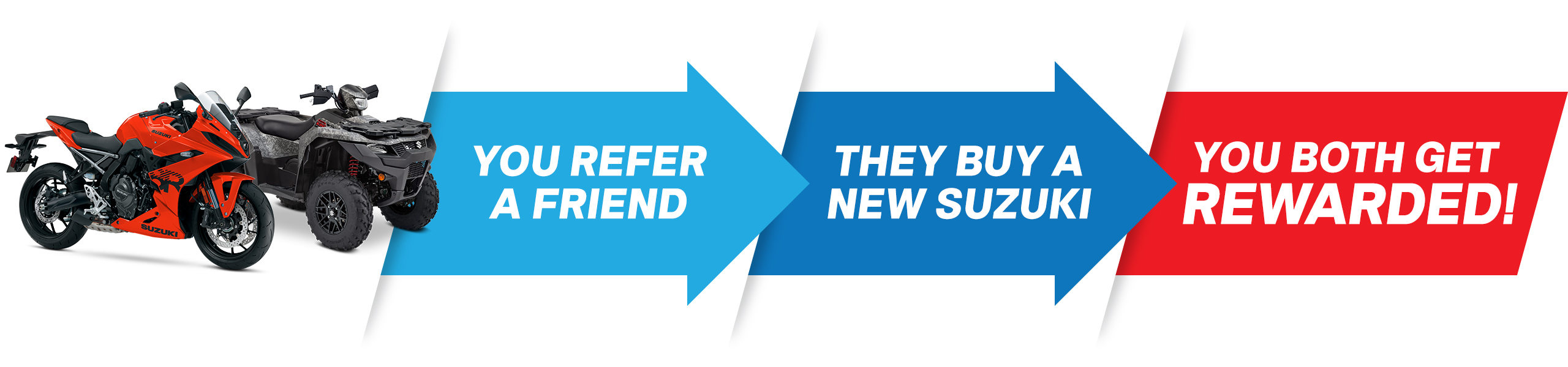 Own a 2016 or newer Suzuki? For a limited time, Suzuki will give you and your friend Suzuki Bucks rewards vouchers for participating in our referral program.