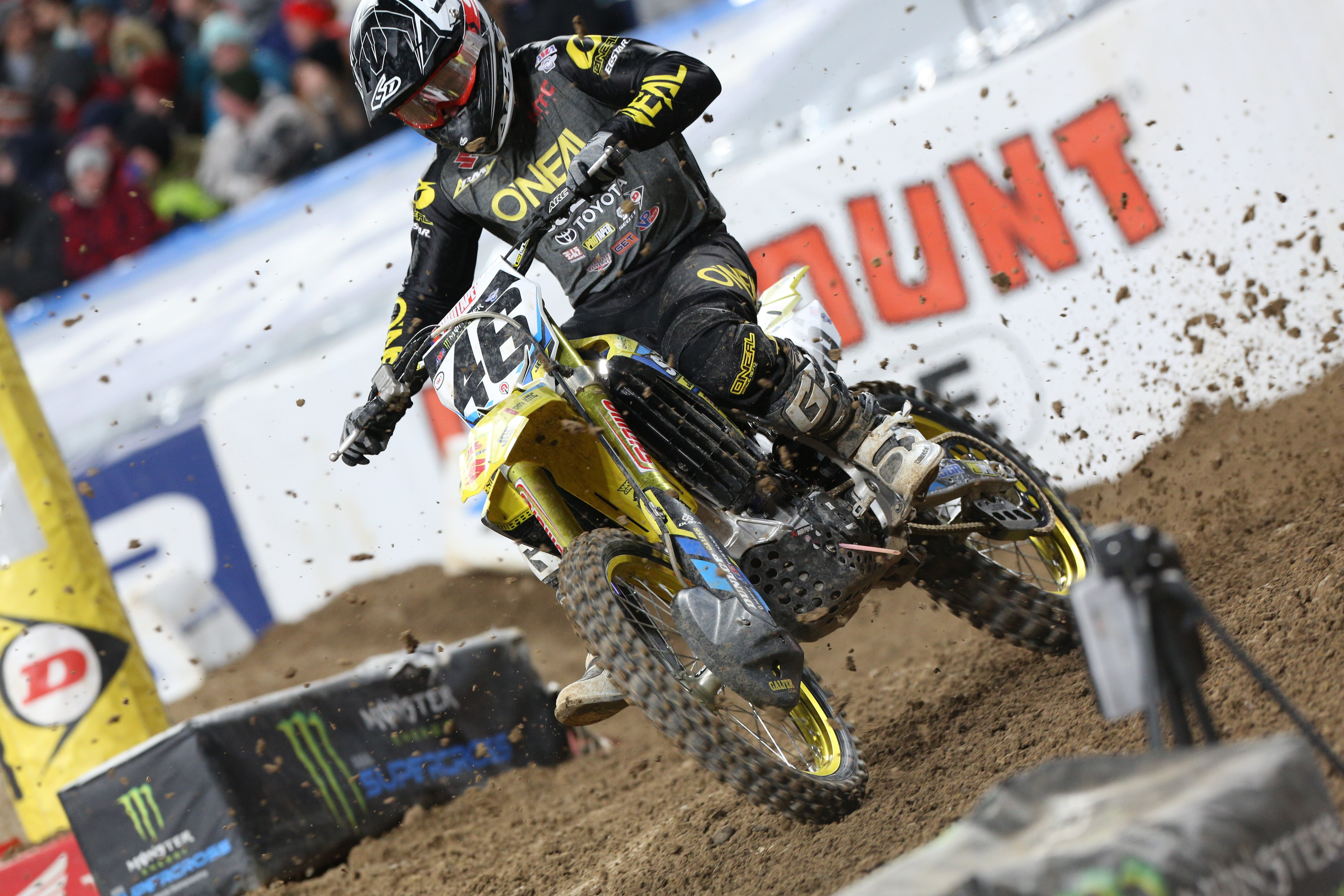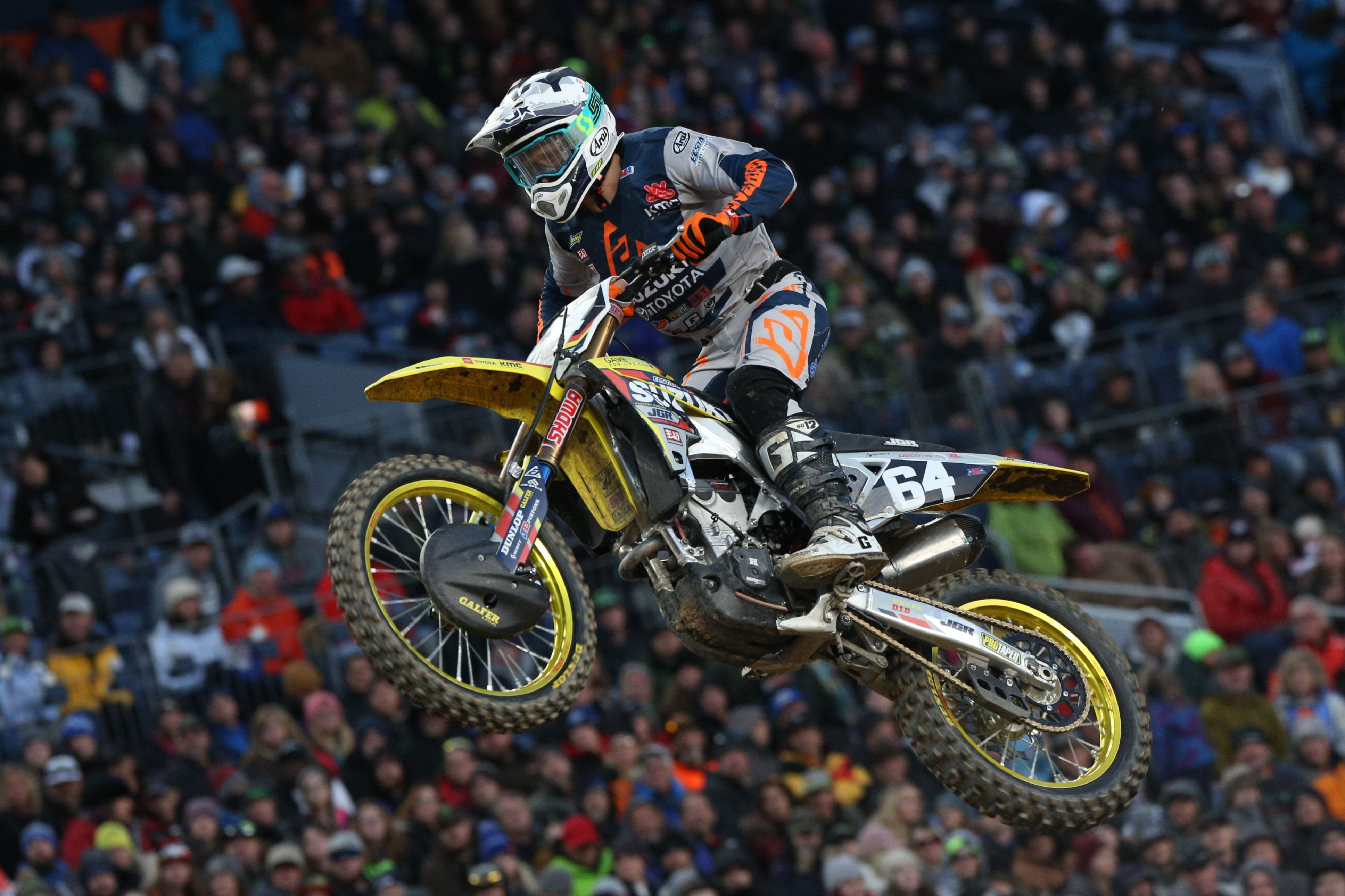 Justin Hill was dealing with a bulging disc in his lower back after misjudging a triple jump at the Nashville Supercross. He underwent extensive physical therapy this past week in an effort to race Denver and his hard work paid off. Hill put his Suzuki RM-Z450 in the main event, and proceeded to score his second top-ten of the year. As a result, Hill improved his position in the points standings.