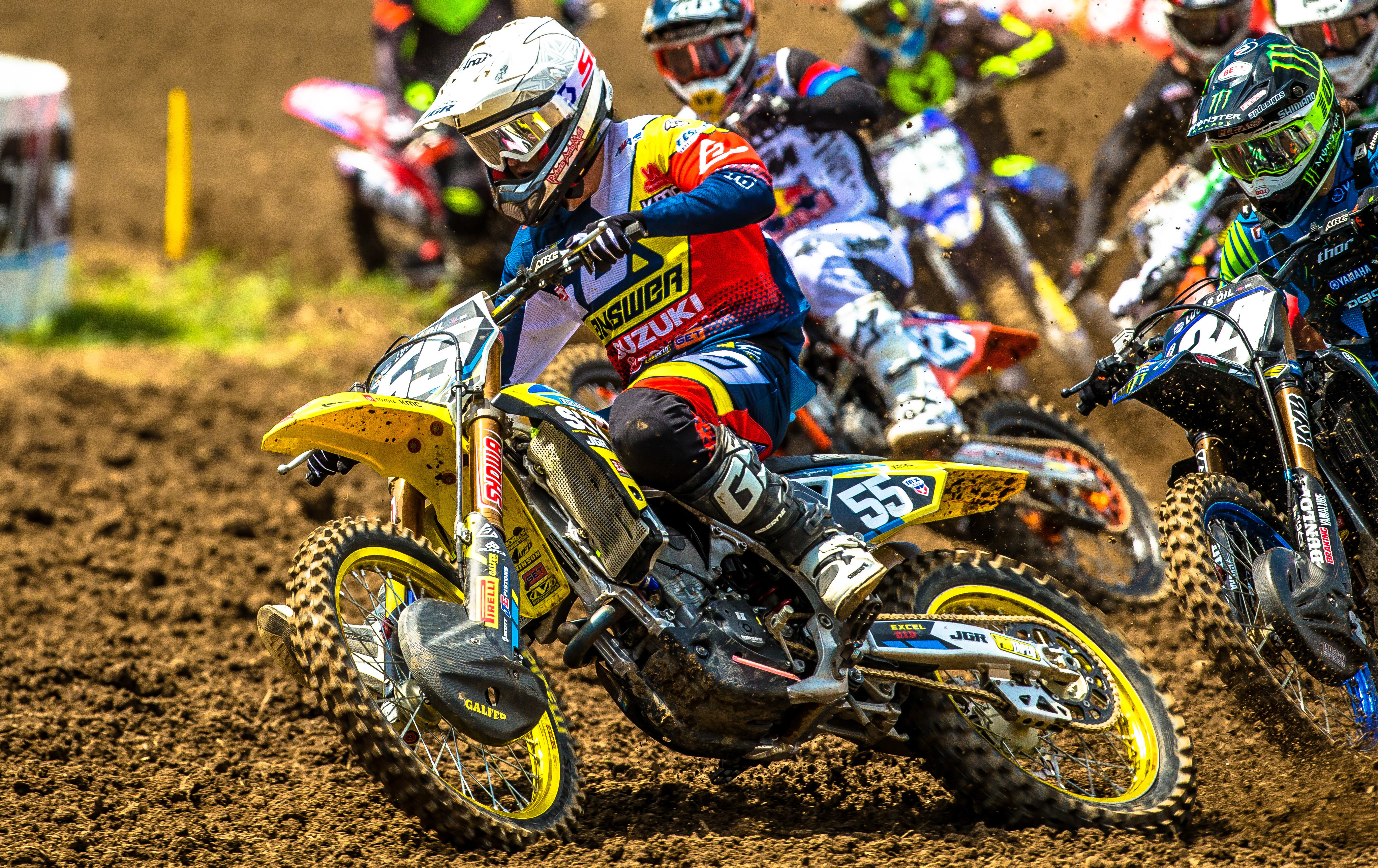 Kyle Peters (#55) shows speed as he grabs the first moto holeshot on his RM-Z250.