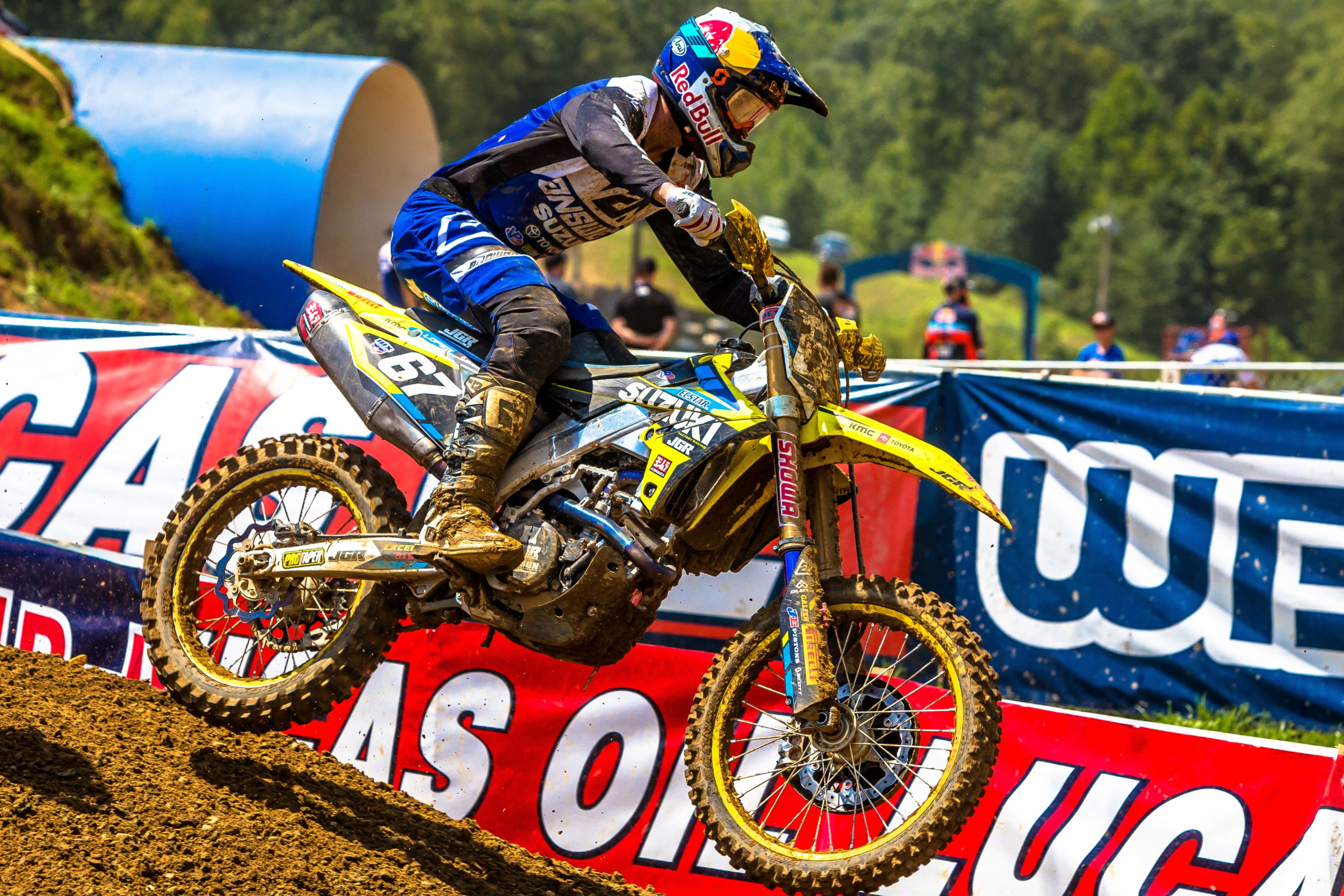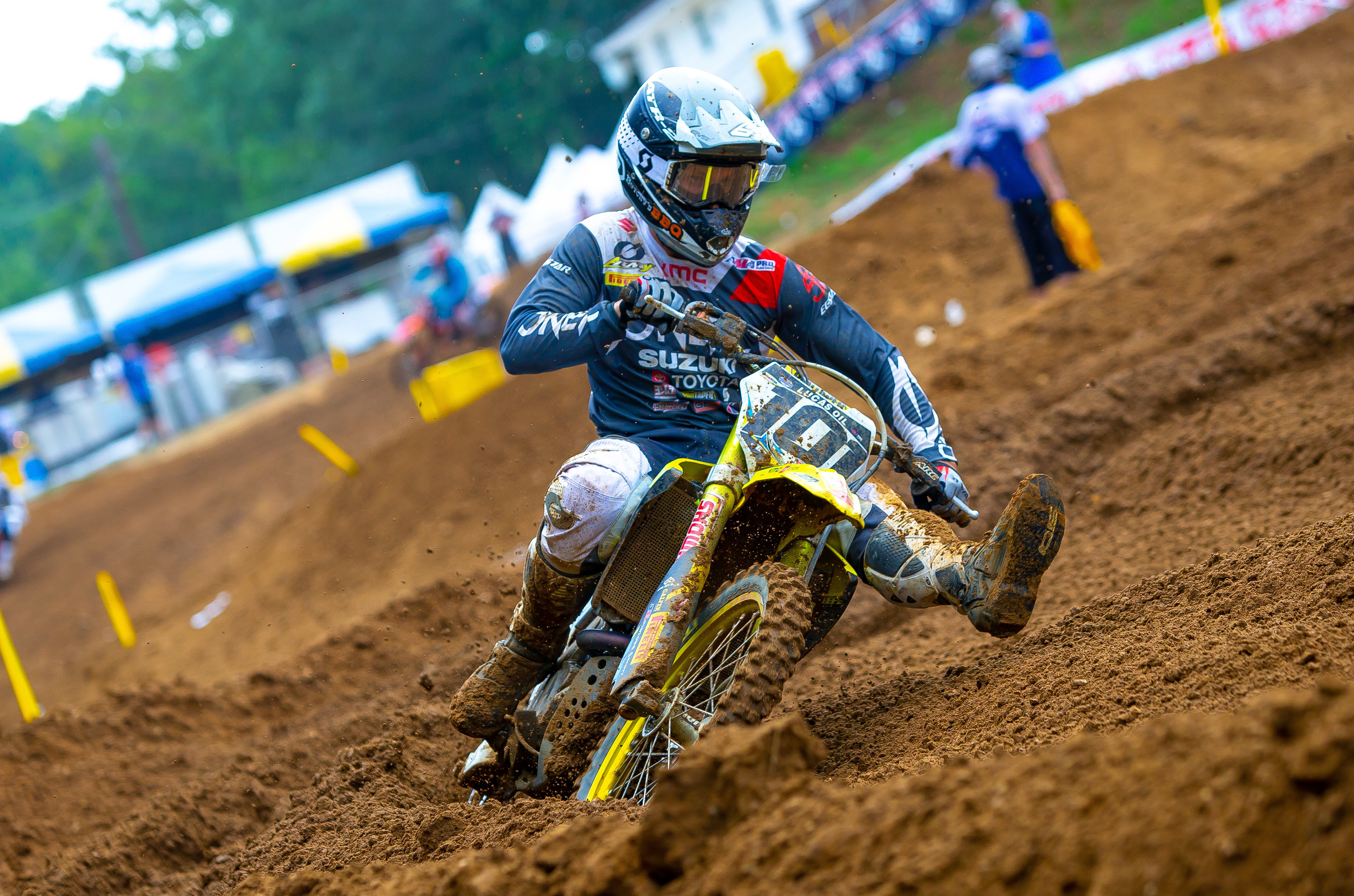 Brea, CA (August 19, 2019) - The JGRMX/Yoshimura/Suzuki Factory Racing Team traveled just outside of Washington D.C. to the famed Budds Creek circuit in Mechanicsville, Maryland this past weekend for the penultimate round of the 2019 Lucas Oil Pro Motocross Championship. Alex Martin led the charge on his Suzuki RM-Z250, scoring a podium finish in the second moto. Teammate Enzo Lopes made his return to racing after a three-month hiatus and earned points, while Kyle Peters remained consistent. RM-Z450 fill-in Fredrik Noren fought-hard through the challenging conditions and moved up in the overall points standings.