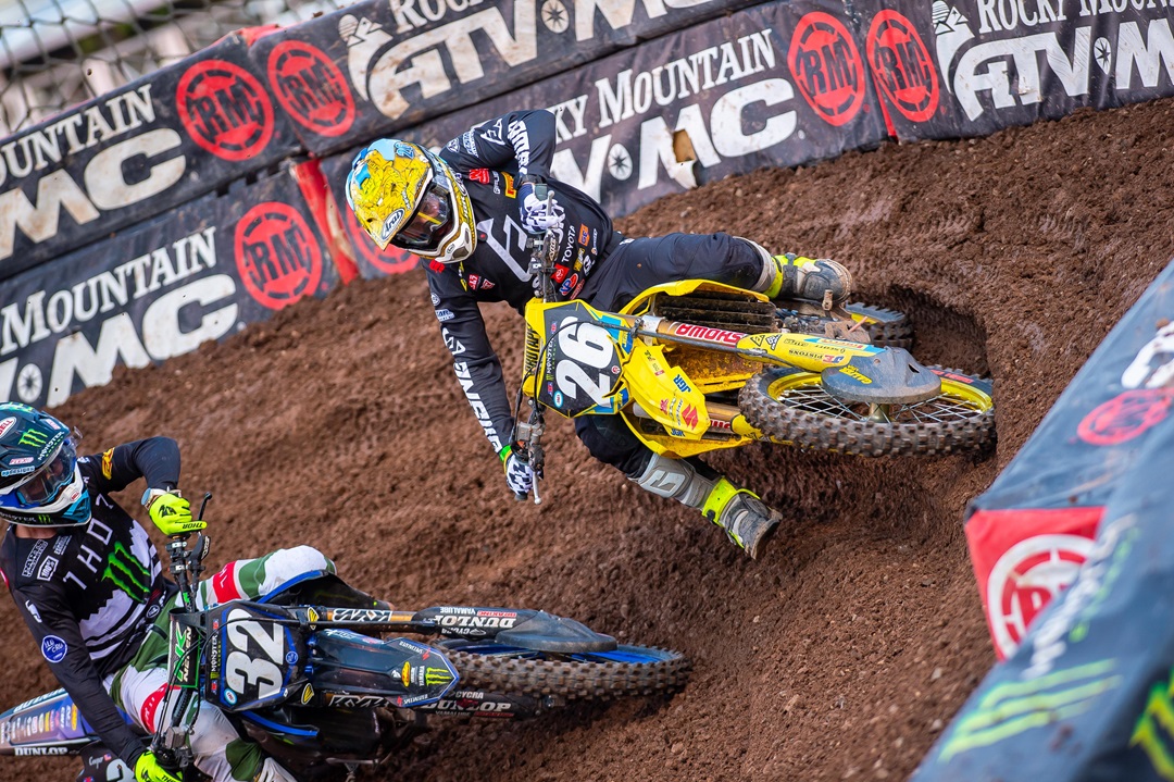 Brea, CA (June 15, 2020) – The JGRMX/Yoshimura/Suzuki Racing team tackled Round 15 of the 2020 Monster Energy Supercross series in Salt Lake City, Utah with improved starts and finishes. Broc Tickle turned an LCQ holeshot into a second-place finish, and then battled toward a top-ten on his Suzuki RM-Z450 to match a season-best. Fredrik Noren showed top form, but a mistake prevented the finish that his speed promised. Suzuki RM-Z250 rider Alex Martin had an impressive second-place finish in his heat race but was derailed by an on-track incident in the main event.