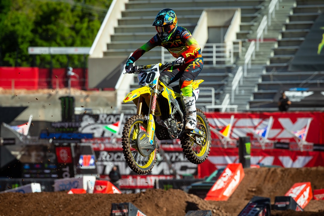 Brea, CA (June 18, 2020) – After a tumultuous season filled with injuries and setbacks, the JGRMX/Yoshimura/Suzuki Racing team heads into the final round of the 2020 Monster Energy Supercross series following strong rides at the penultimate round inside Rice-Eccles Stadium in Salt Lake City, Utah. Broc Tickle charged his Suzuki RM-Z450 forward in the main event while teammate Fredrik Noren came away with a season-best finish.