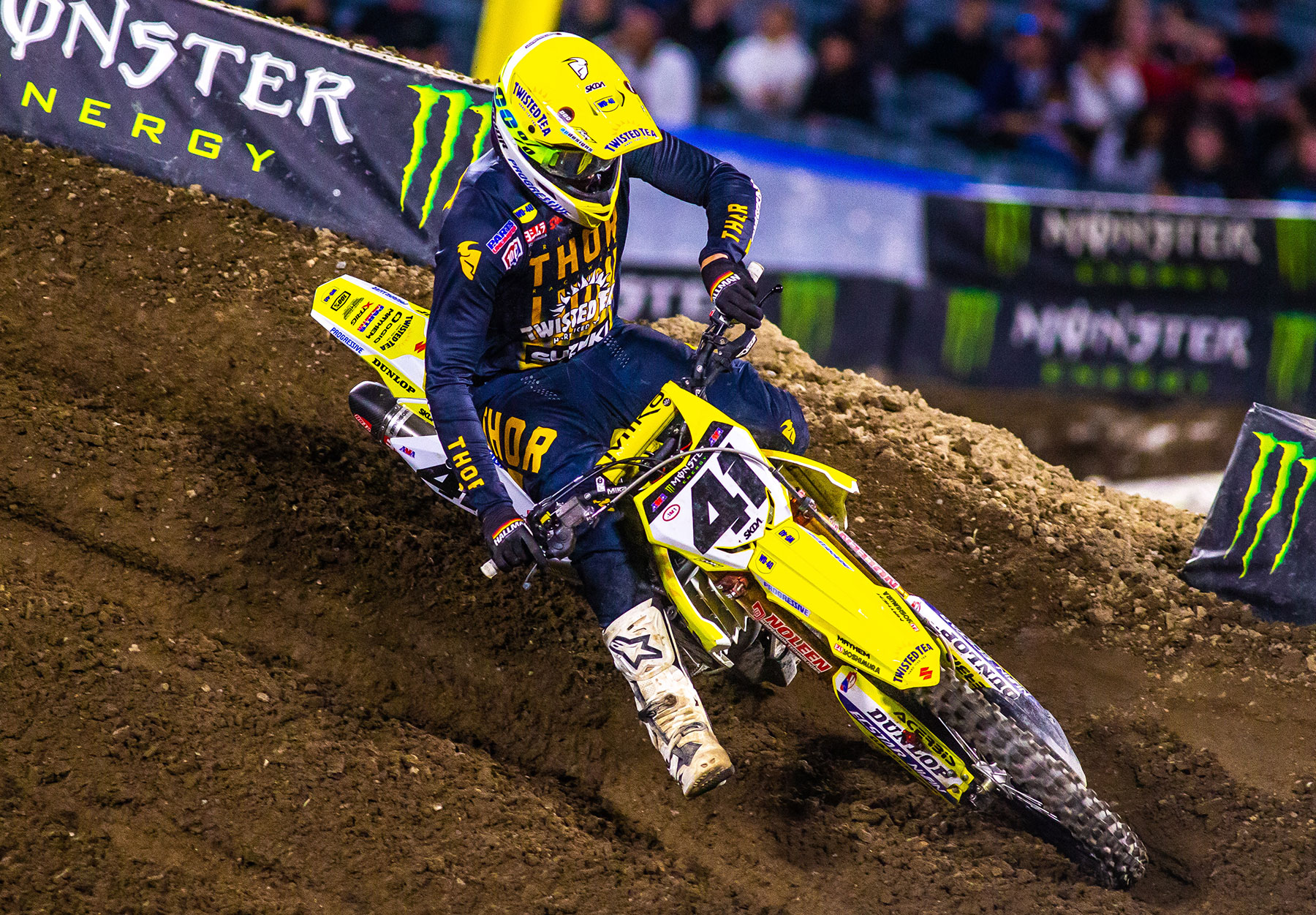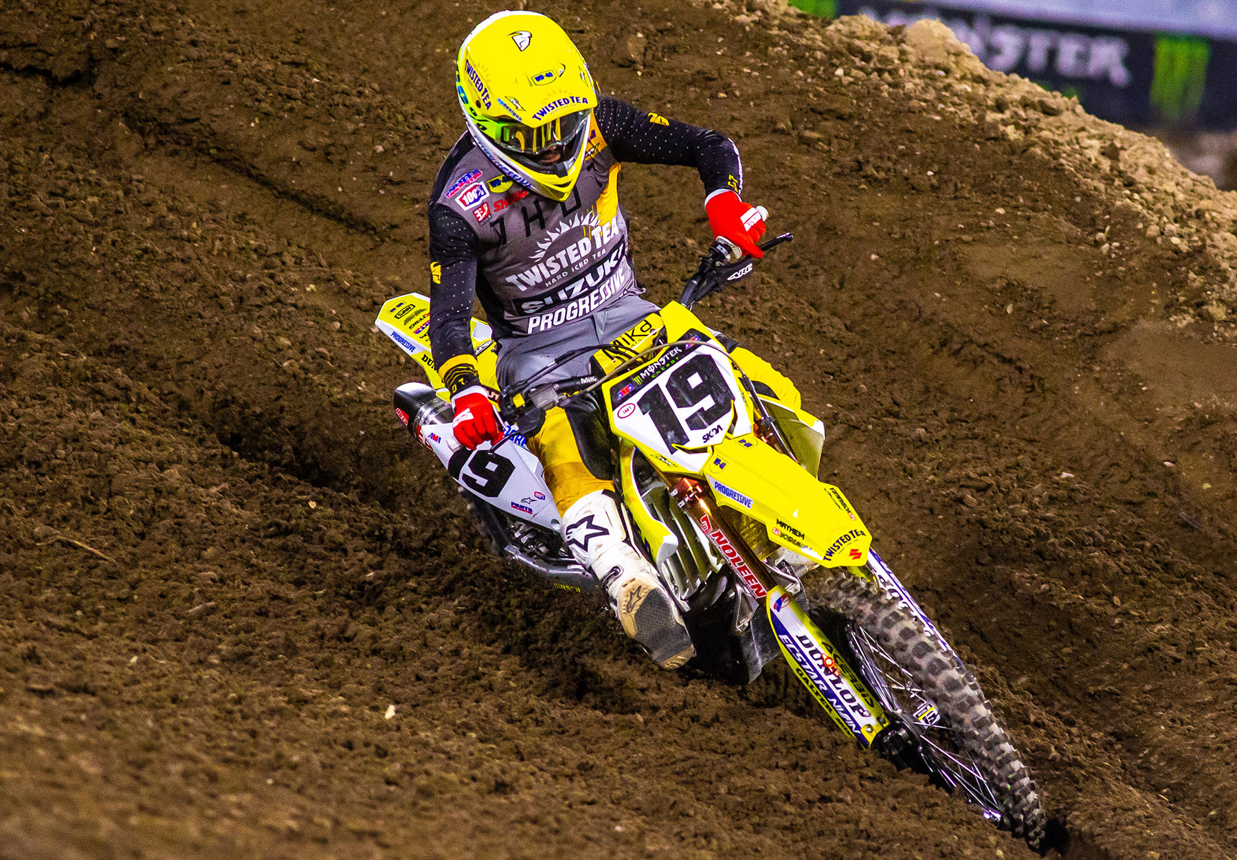 BREA, Calif., February 14, 2022 — The three Twisted Tea Suzuki Presented by Progressive Insurance athletes tackled an especially challenging track at round six of the Monster Energy Supercross series and head out of California with a head of steam and a healthy collection of points. Brandon Hartranft carded another strong finish and further established himself in the 450 class with his Twisted Tea Suzuki RM-Z450. Justin Bogle used his Twisted Tea Suzuki RM-Z450 to gain in the title points standings and Twisted Tea Suzuki's Adam Enticknap put his RM-Z450 on the board with his best performance of the season. BarX/Chaparral Suzuki's Carson Mumford had the speed, but unfortunately, an existing shoulder injury prevented him from another strong night in 250 West class racing.