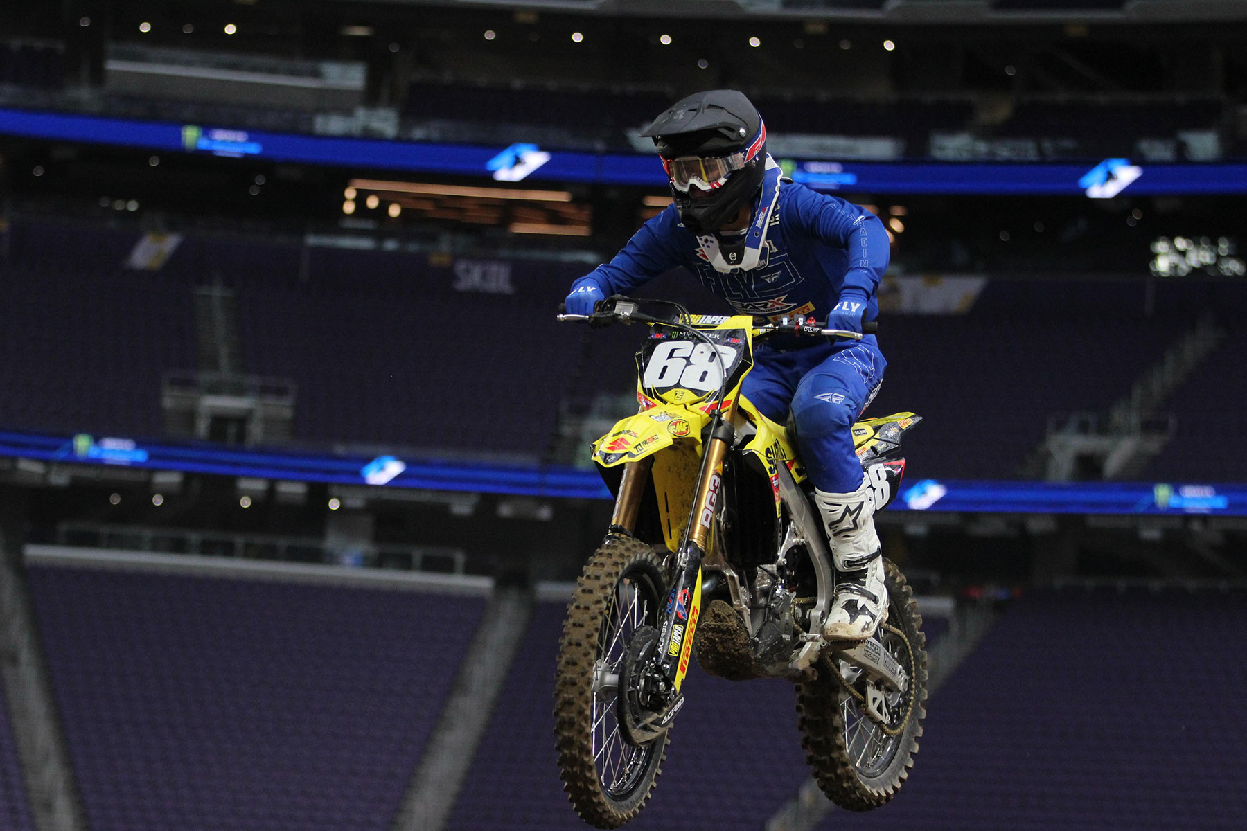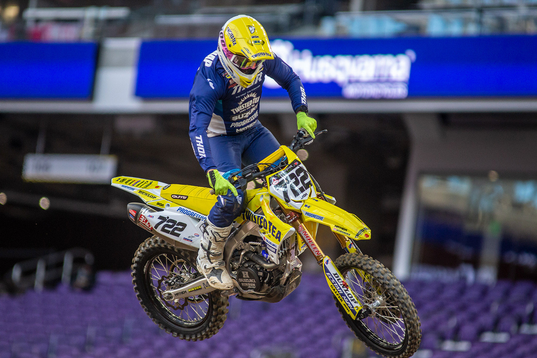 BREA, Calif., February 21, 2022 — Round seven of the Monster Energy Supercross series saw the Suzuki athletes tackle the track inside U.S. Bank Stadium in Minneapolis, Minnesota. The event marked both the start of 250 East Coast racing and the return to racing of BarX/Chaparral Suzuki's Derek Drake, who posted a strong return performance on his Suzuki RM-Z250. Twisted Tea Suzuki Presented by Progressive Insurance athlete, Brandon Hartranft excelled in the tacky, soft soil for another strong ride with his Suzuki RM-Z450. His Twisted Tea Suzuki teammate Justin Bogle used the round to notch his Suzuki RM-Z450 up in the point standings and Adam Enticknap won more fans with his Twisted Tea Suzuki RM-Z450. BarX/Chaparral Suzuki supercross rookie Preston Kilroy got his taste of stadium racing aboard his Suzuki RM-Z250.
