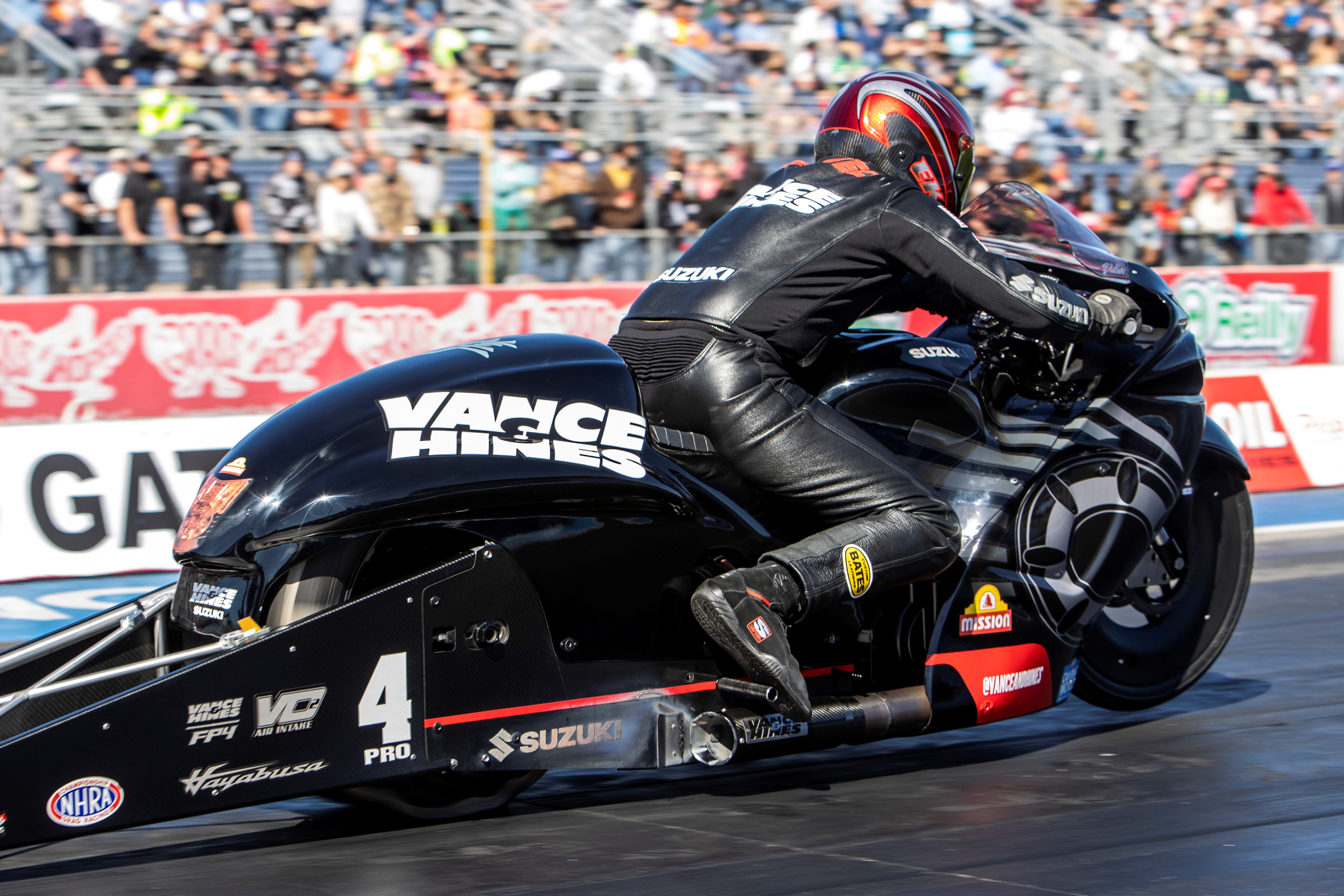 The Vance & Hines/Mission Suzuki Pro Stock Motorcycle team will be back in action April 22-24 when the NHRA Pro Stock Motorcycle season resumes at Houston Raceway Park in Houston, Texas. For more information, visit www.NHRA.com.