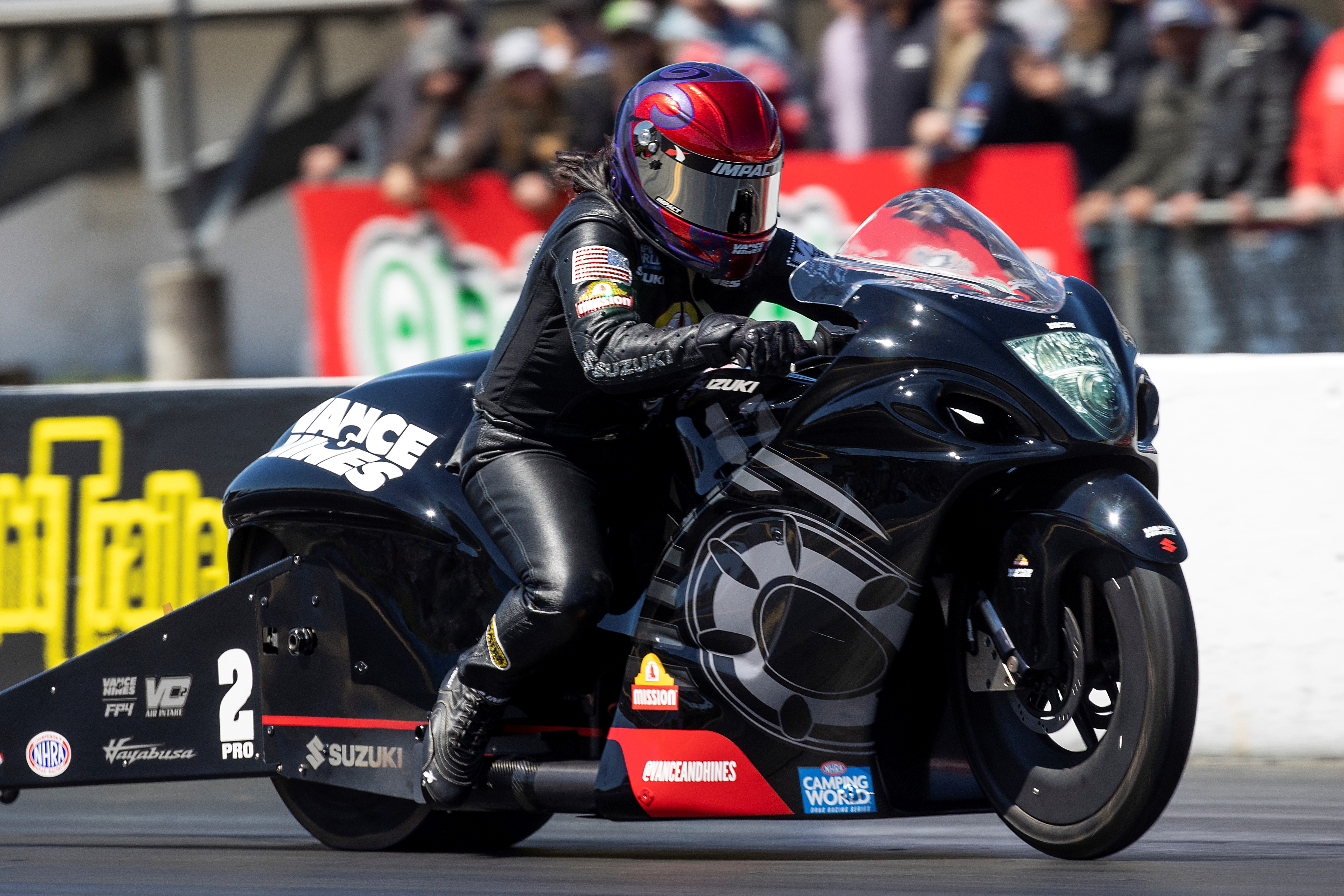 “We spun the tire pretty hard in the first round and I wasn’t able to recover from it,” Sampey said. “I’m disappointed because I knew we were capable of setting a record in these conditions if we had left the starting line well. We witnessed it with Karen Stoffer. I know I have exactly what I need with Vance & Hines power and Suzuki on board this year. I spent some time at the Suzuki display trailer this weekend signing autographs and taking photos with NHRA fans. I feel like I’m back at home. I started racing a Suzuki RM50 when I was six years old. I can’t wait to see what we’re going to do together this season.”