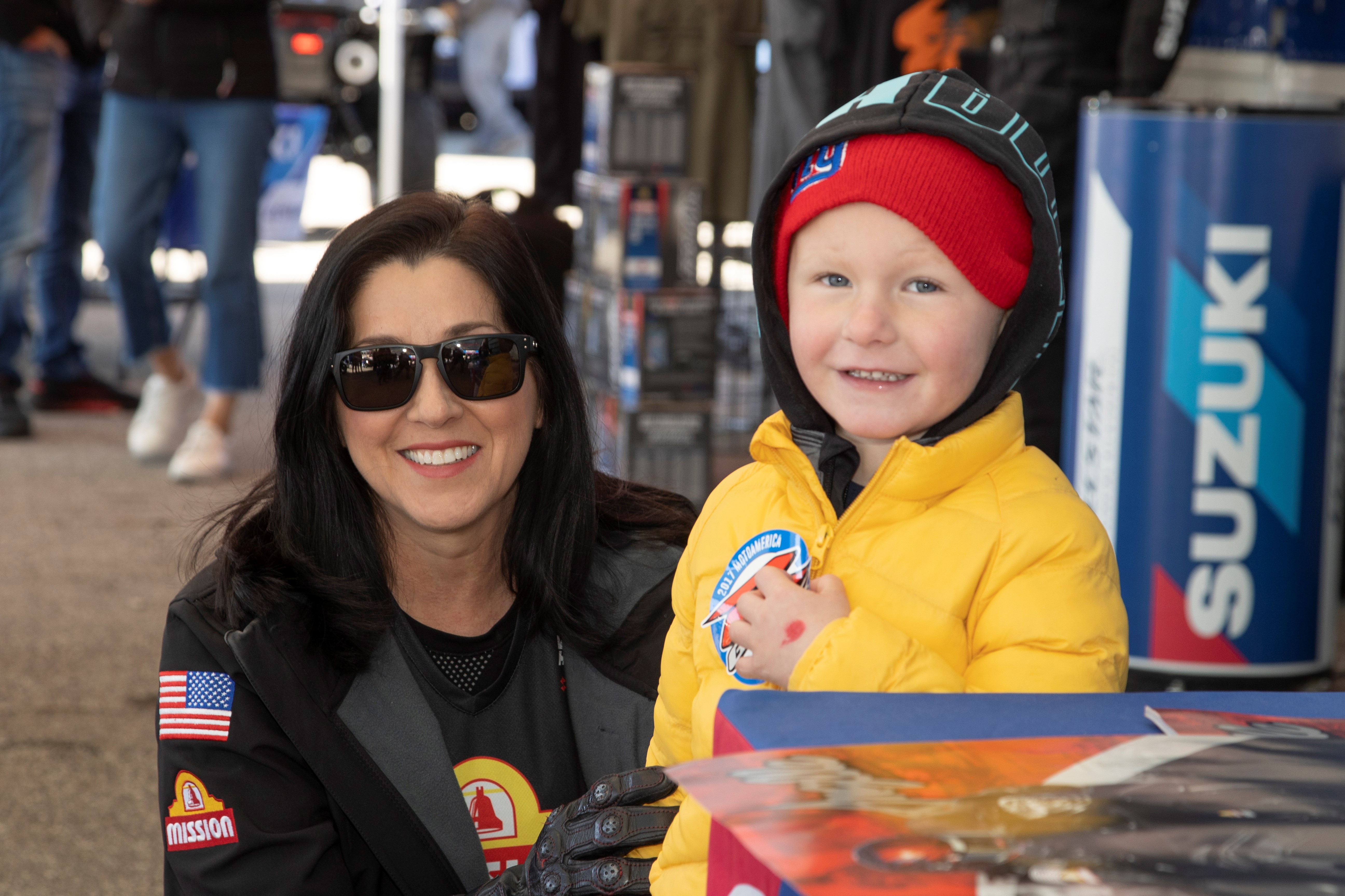 An excited young fan with Angelle Sampey signing autographs in the Suzuki display.