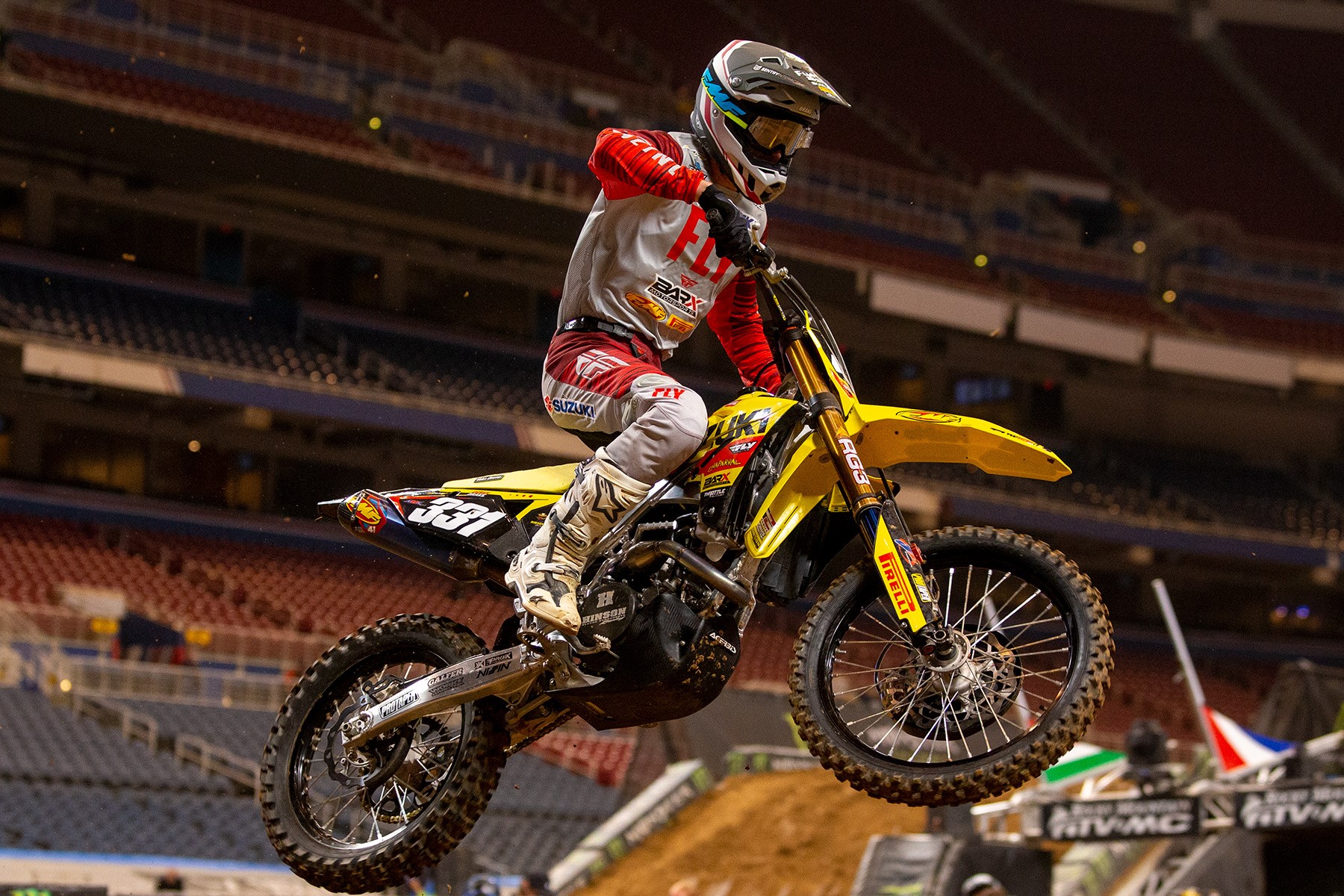 Brandon Hartranft (41) and his Suzuki RM-Z450 remained consistent with three top ten finishes as the St. Louis track broke down through the night's racing.