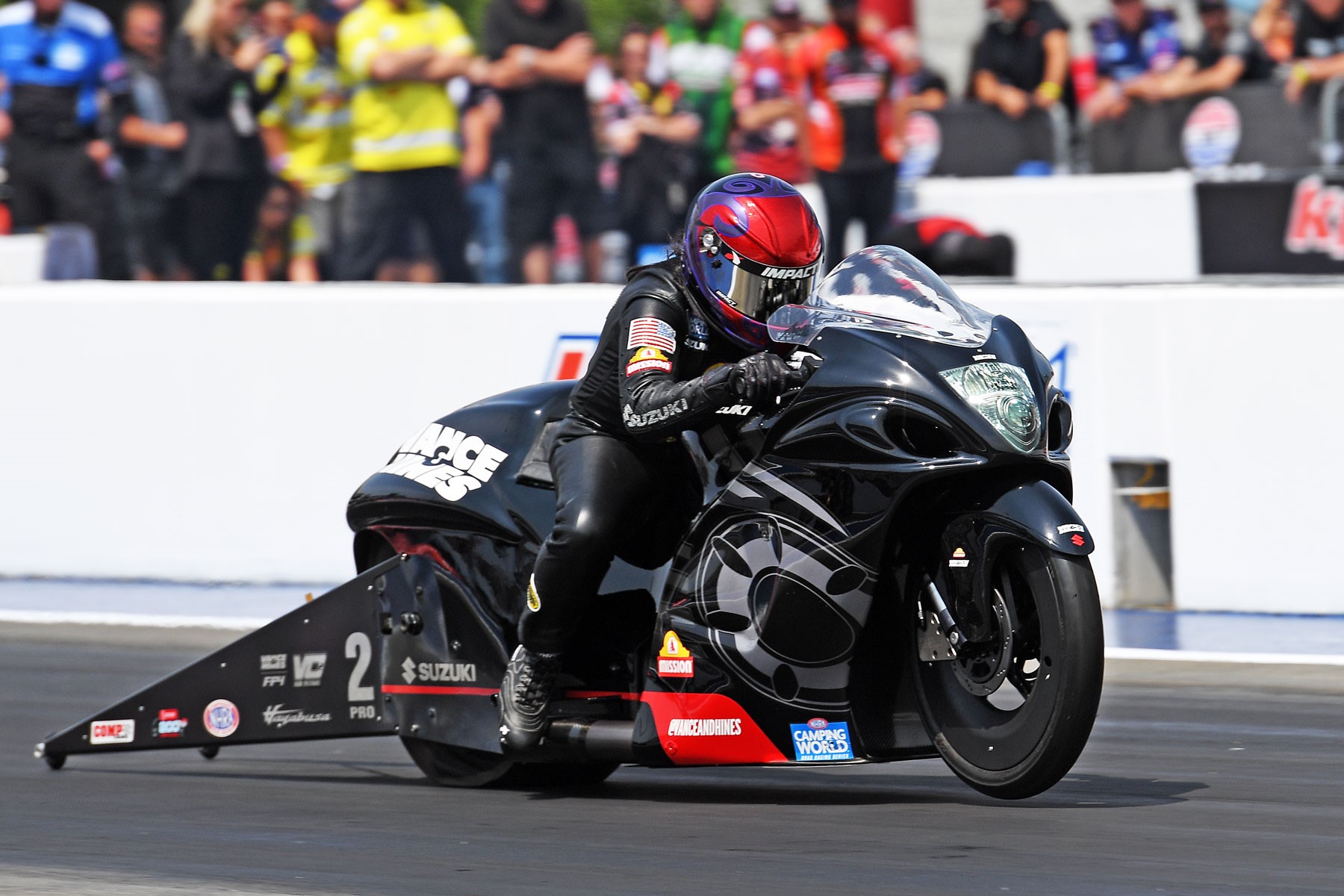 “It's great to have the number one [qualifying spot] for Suzuki and it was nice for Angelle to get her career-best ET,” said Hines. “Angelle would have put up some better speeds if I had gotten the chassis sorted a little bit earlier in the weekend, but we’re still learning how some of the aerodynamic and other changes we made affect her getting down the track. Even though she spun the tire hard, the bike went perfectly straight and put a decent speed on the board. We're homing in on it and we'll be ready for Virginia in two weeks.”