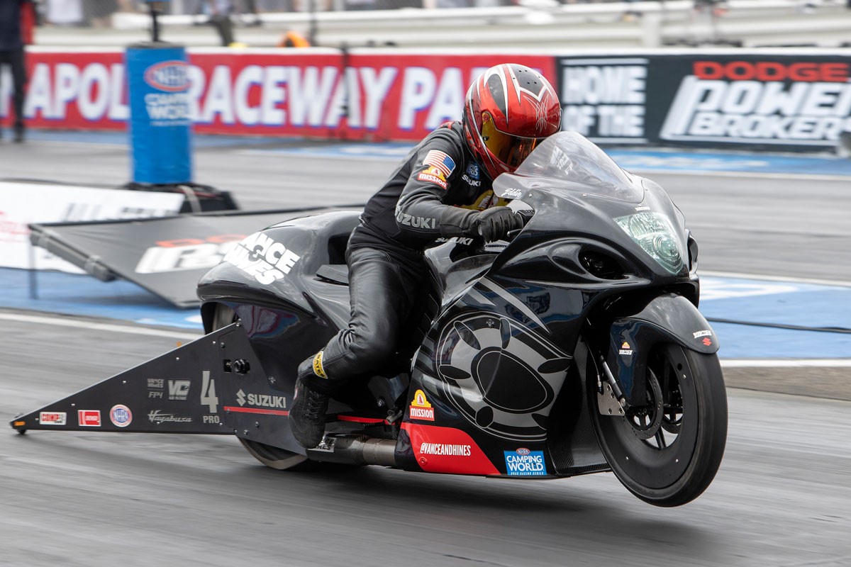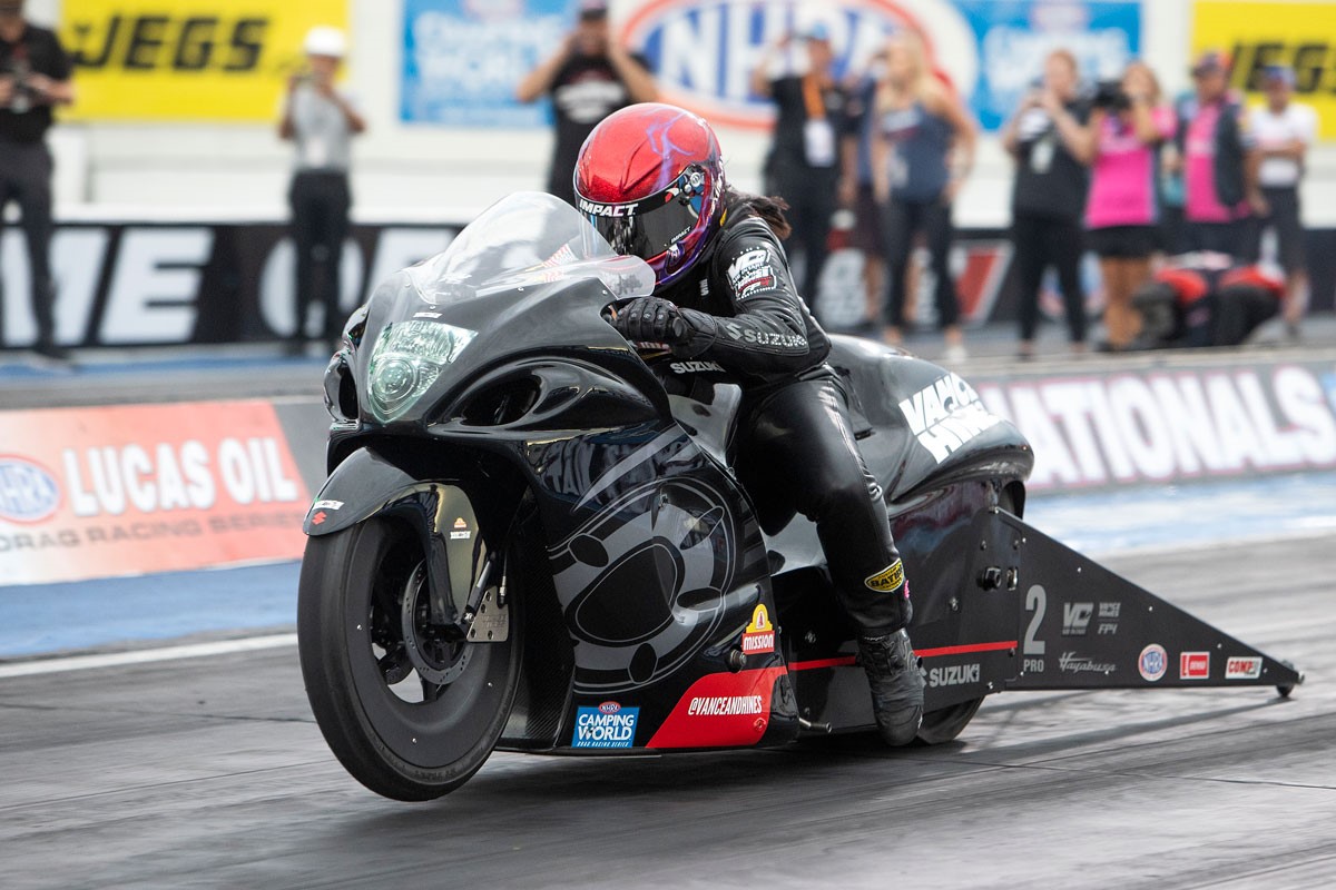 The Vance & Hines/Mission Suzuki team will be back in action September 15-18 for the first round of the Countdown to the Championship at the Pep Boys NHRA Nationals at Maple Grove Raceway in Mohnton, PA. The 2022 Pro Stock Motorcycle season concludes November 10-13 at the Auto Club NHRA Finals at Auto Club Raceway in Pomona, CA.