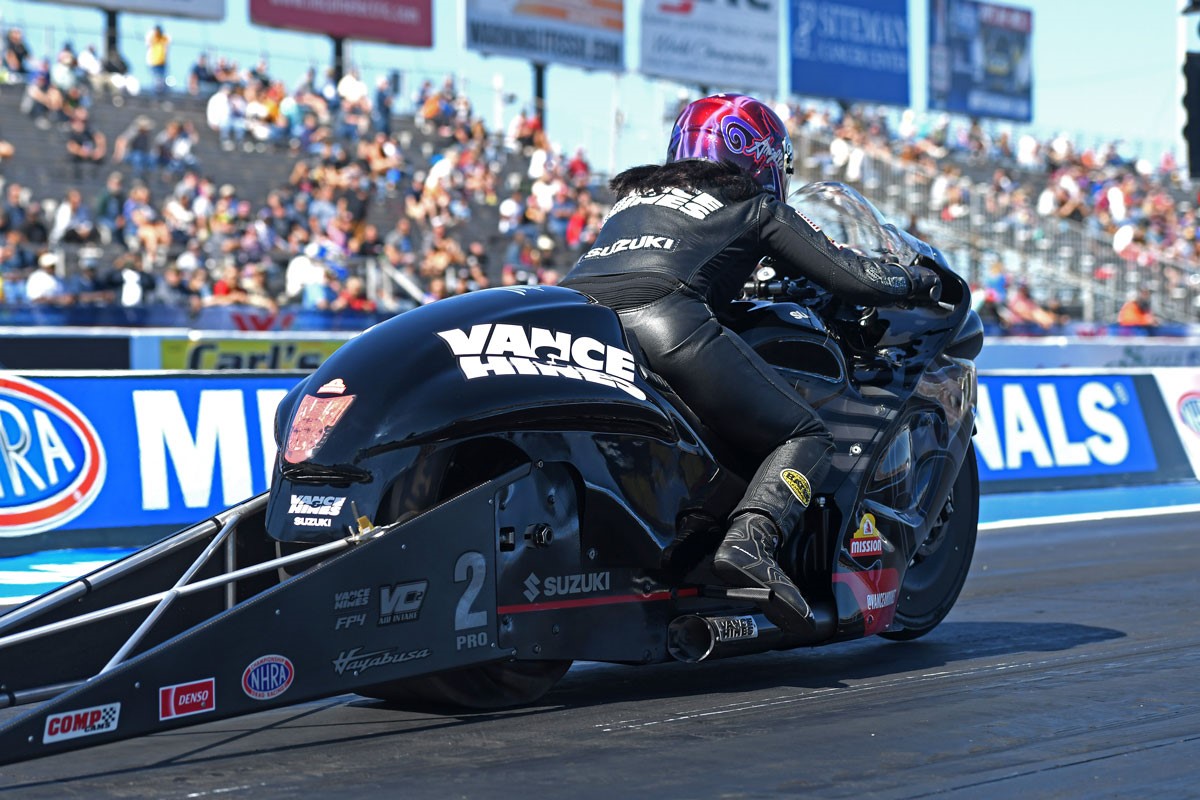 The Vance & Hines/Mission Suzuki team will be back in action October 13-16 at the Texas NHRA FallNationals at Texas Motorplex in Ennis, TX. The 2022 Pro Stock Motorcycle season concludes November 10-13 at the Auto Club NHRA Finals at Auto Club Raceway in Pomona, CA.