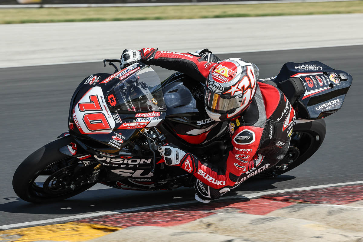 Vision Wheel M4 ECSTAR Suzuki’s Richie Escalante remains persistent in his hunt for a maiden MotoAmerica Superbike podium. Despite starting from Row 3, Escalante leaped off the line aboard his Suzuki GSX-R1000R Superbike and slashed his way up to fifth at the beginning of the race. Another pass executed while climbing the start/finish line hill at the end of the opening lap saw him earn one more position. Following a quick back-and-forth, Escalante established himself a clear and solid fourth, when the race was ultimately called complete with a red flag after eight of a scheduled 12 laps. The result equaled his best-ever finish in the class – marking the fourth time he’s finished fourth in Superbike and the second time he’s done so in as many attempts.