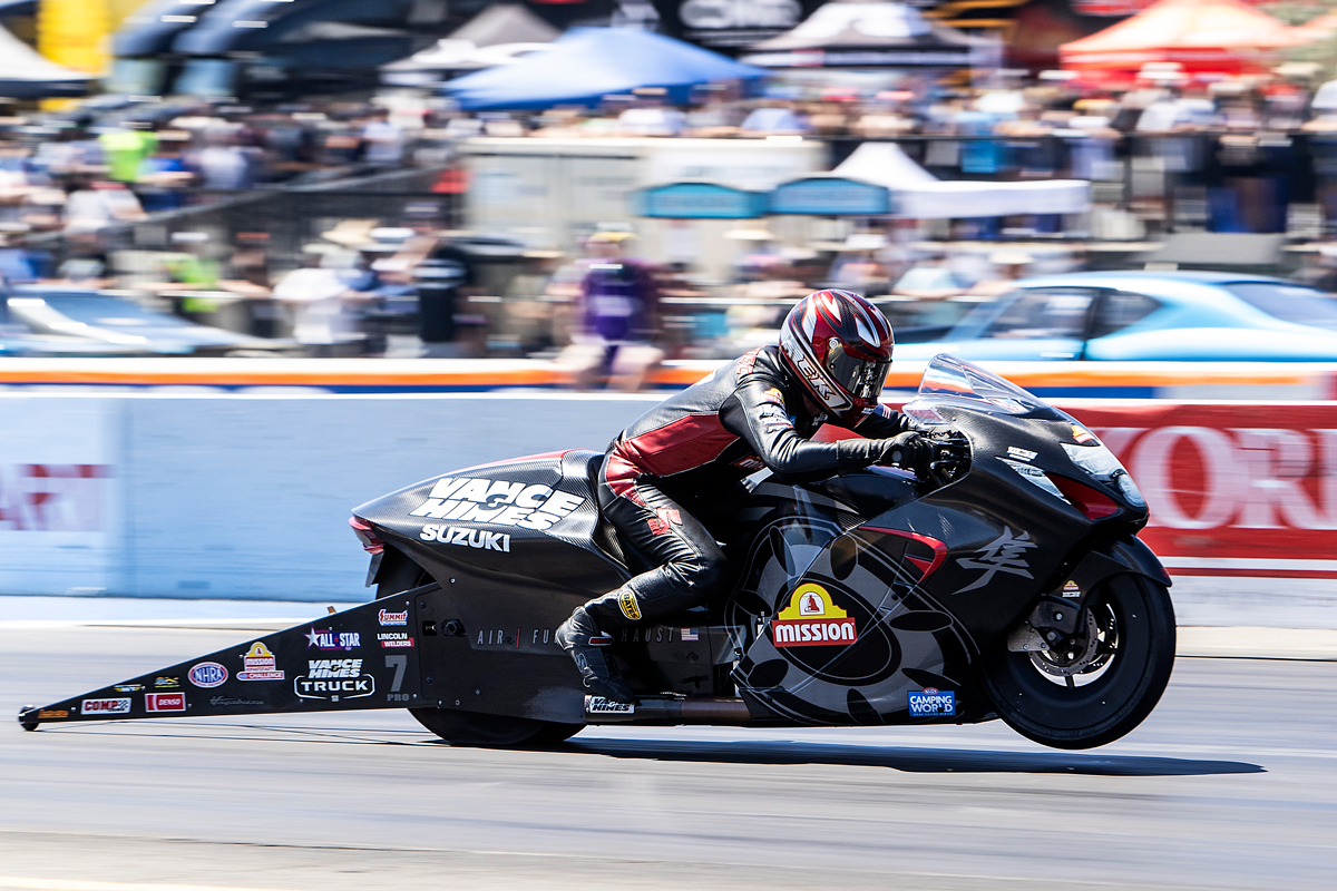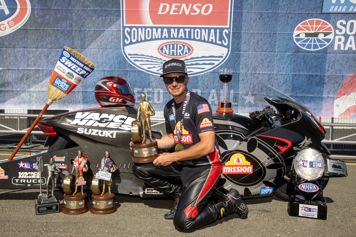 BREA, CA – July 31, 2023 – Continuing to show dominance in his history-making rookie season, Vance & Hines/Mission Suzuki rider Gaige Herrera raced his Gen 3 Suzuki Hayabusa to a sixth victory of the season Sunday at the DENSO NHRA Sonoma Nationals at Sonoma Raceway in Sonoma, California, becoming the first Pro Stock Motorcycle rider to sweep the NHRA’s fabled Western Swing.