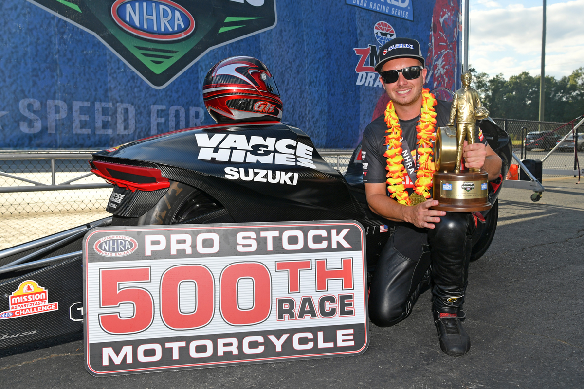 The performance differential of Herrera’s Gen 3 Suzuki Hayabusa was so great this weekend that three of his four opponents in the elimination rounds, including Hector Arana, Jr. who raced Herrera in the final round, were goaded into making red-light jumpstarts in desperate attempts to combat Herrera’s dominant speed advantage. Arana’s foul handed Herrera, who ran 6.726 seconds at 201.34 mph, his seventh victory of the season. The win was also a milestone, coming in the Pro Stock Motorcycle class’s 500th race in NHRA competition.