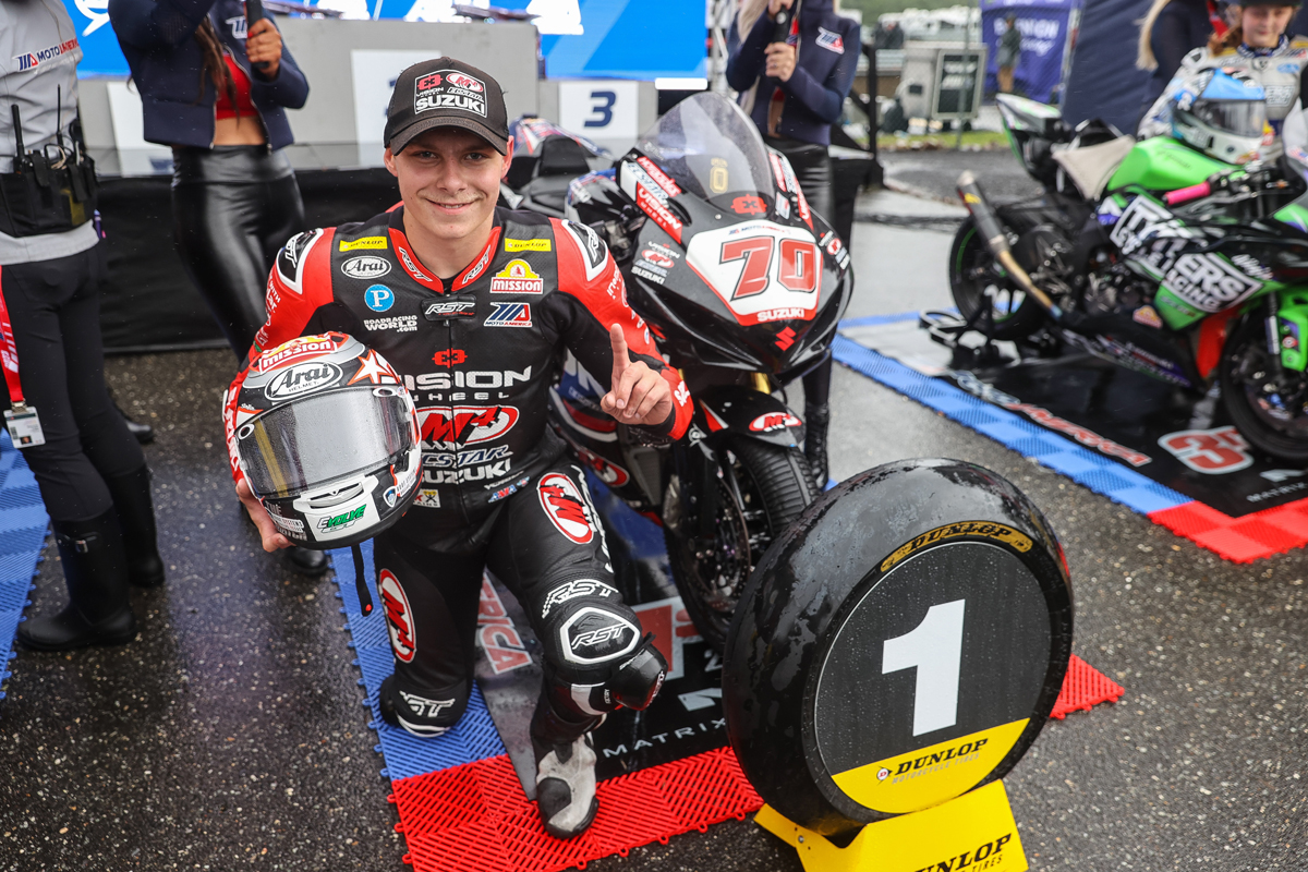 The rain did not stop Tyler Scott (70) from victory aboard his GSX-R750 in Race 1.