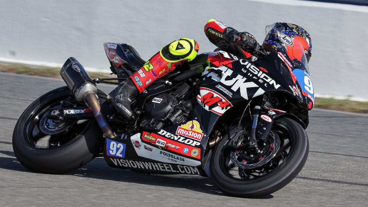 Meanwhile, Vision Wheel M4 ECSTAR Suzuki’s Rossi Moor (92) and RevZilla/Motul/Vance & Hines’s Rocco Landers (97) demonstrated the vast potential of the all-new Suzuki GSX-8R sportbike’s parallel-twin platform in the Twins Cup season opener.