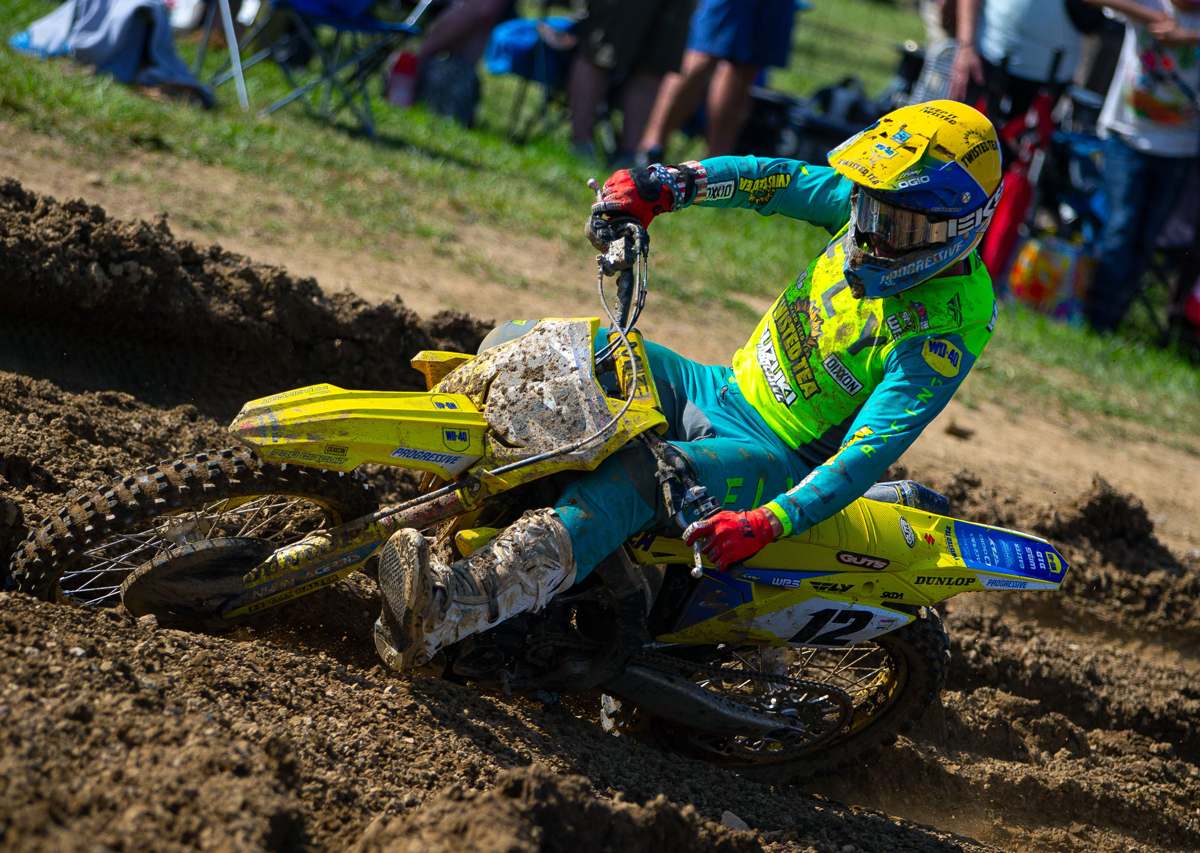 Shane McElrath (12) was impressively fast on the Pennsylvania track. In the final qualifying session, McElrath posted a fourth-fastest lap time, fast enough to qualify him into the top five overall. McElrath turned strong starts into season-best race finishes. Two top-ten moto results put the Suzuki rider into the top ten overall at High Point.