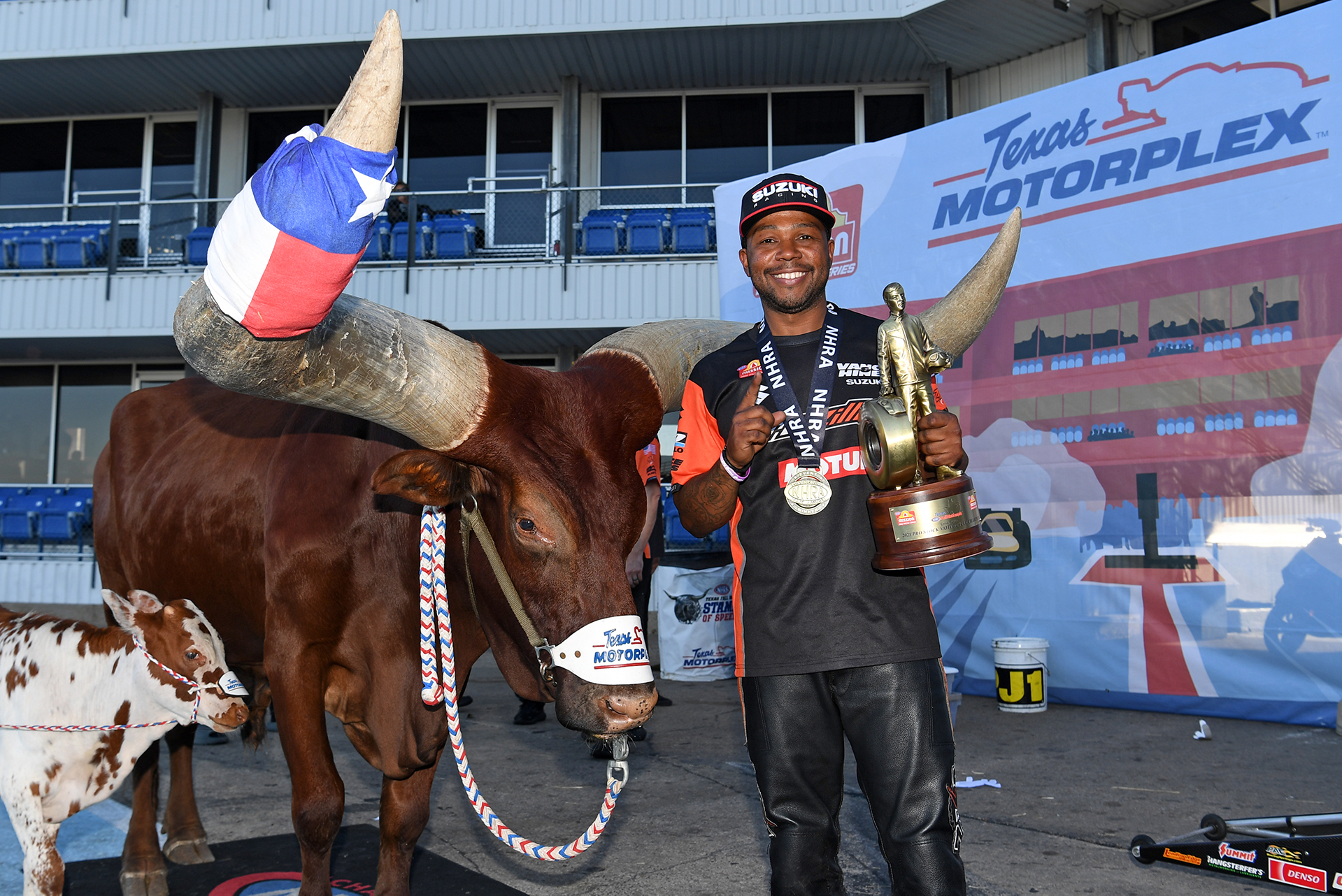 Brea, CA (October 13, 2025) – Richard Gadson raced his RevZilla/Motul/Vance & Hines Suzuki Gen 3 Hayabusa to his fourth win of the season and extended his lead in the Pro Stock Motorcycle Countdown to the Championship playoffs at the Texas NHRA FallNationals at Texas Motorplex in Ennis, TX, on Sunday.