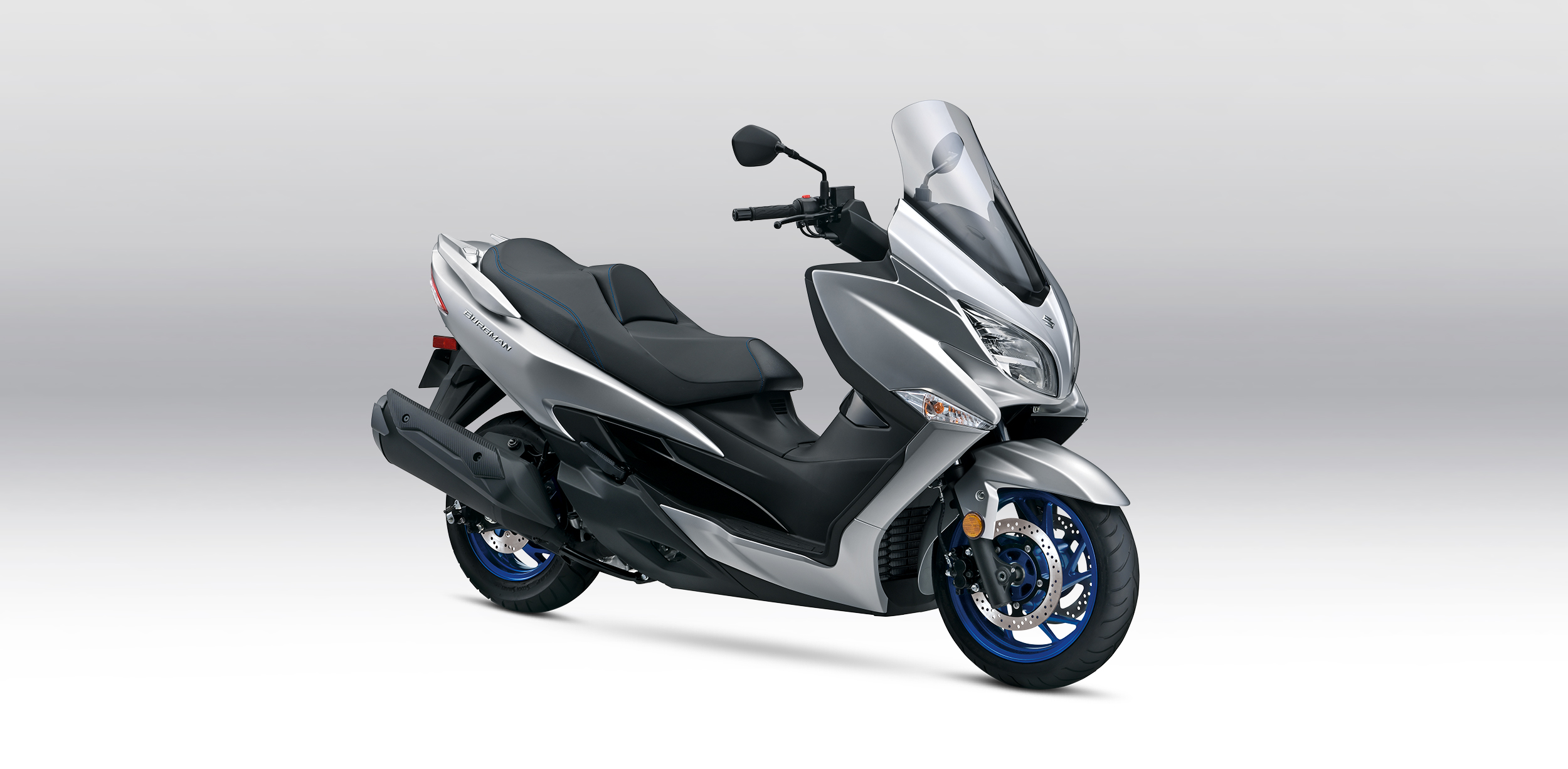 Unmatched as the sport’s premium scooter, the 2024 Suzuki Burgman 400 brings unequaled styling, technical, and rider features that affirms its supremacy over its competitors. The slim and sharp styling is coated with a new Metallic Matte Sword Silver paint scheme with blue wheels that further emphasize the Burgman’s luxury performance appearance.