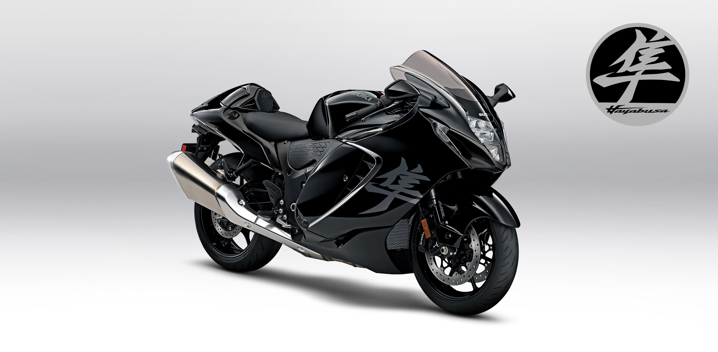 The Hayabusa kanji and name logos have been styled to align with the bodywork’s modern look. Both logos adopt highly stylized strokes and the name logo features a long cross stroke on the “H” that emphasizes a sense of speed.