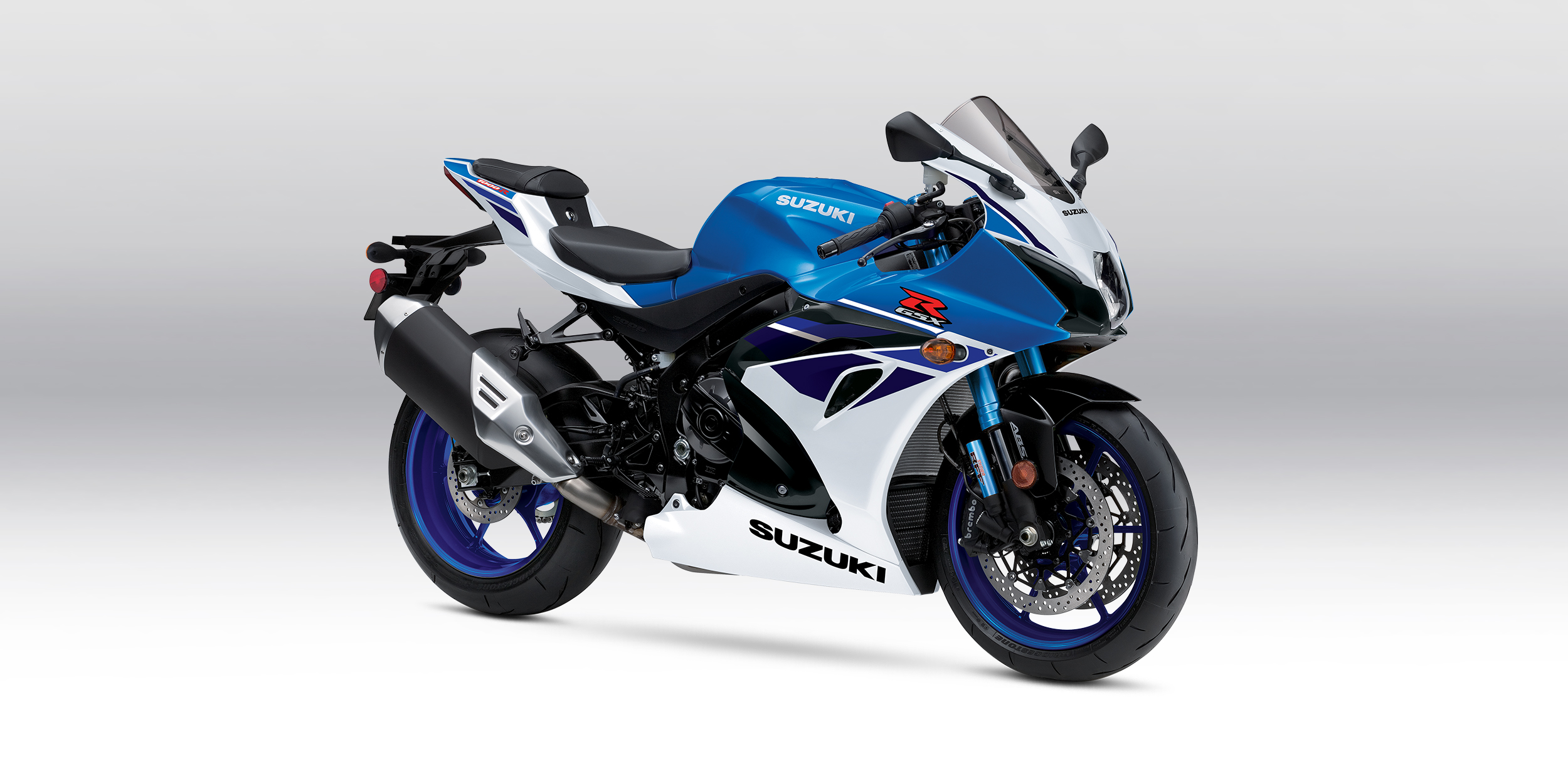 The 2024 GSX-R1000RZ is available in a Pearl Brilliant White / Metallic Triton Blue paint scheme with blue wheels. The paint scheme is accented by blue-anodized suspension components.