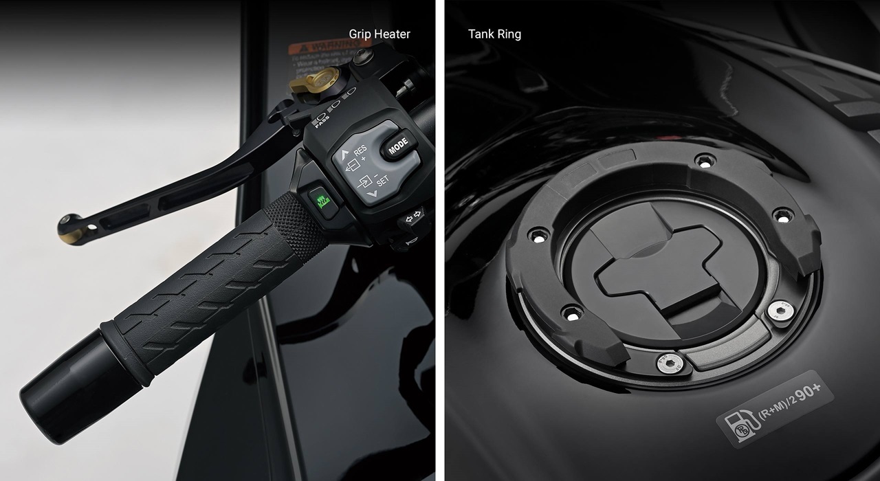 A Combined Brake System allows braking power to both front and rear brakes when operating the front brakes. The ABS** equipped Brembo® Stylema® front brake calipers to grab a pair of 320mm diameter stainless-steel full-floating discs, and a rear ABS** equipped single-piston brake caliper to grab a solo 260mm brake rotor when operating the front brake lever.