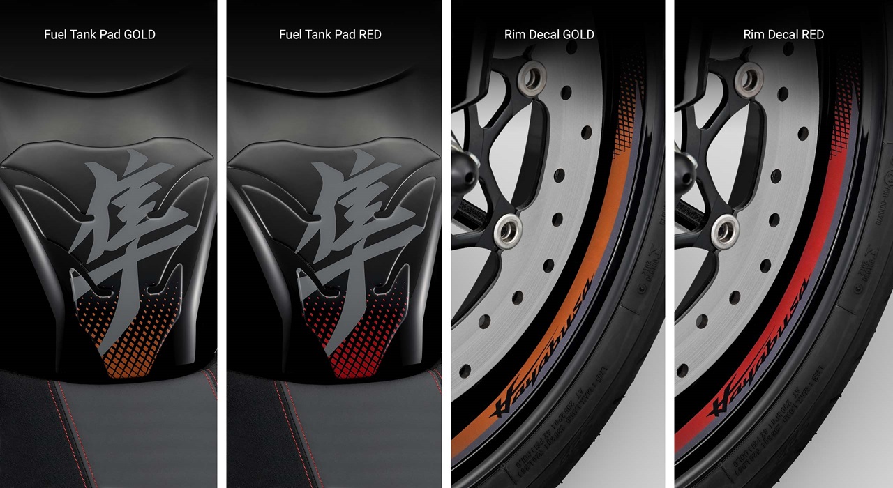 Choose from a pair of sensational new color schemes. Presenting a powerful face is the Candy Daring Red & Glass Sparkle Black colorway and a stately Pearl Vigor Blue & Pearl Brilliant White combination. Each scheme features the prominent and iconic Hayabusa Kanji symbols and name logos.