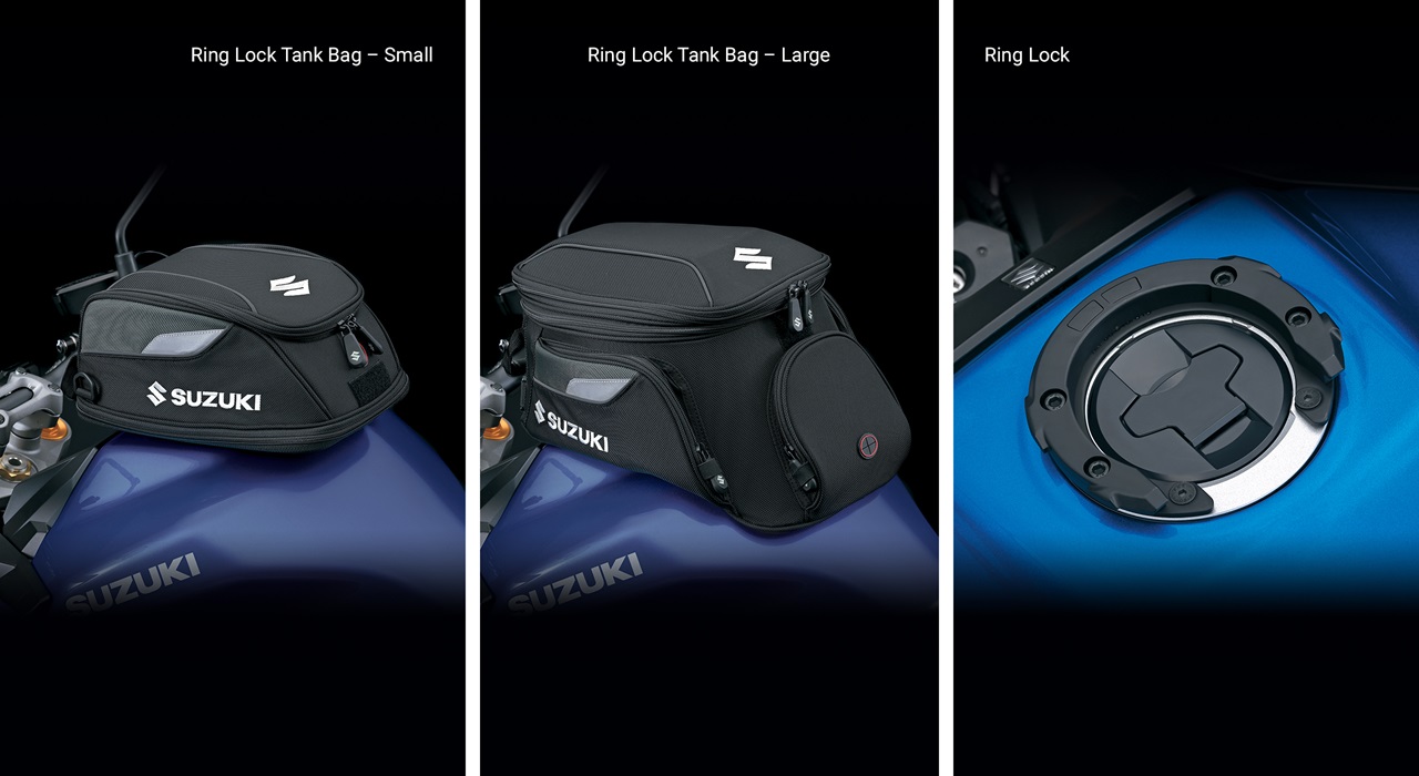 A variety of Genuine Suzuki Accessories are available, such as a solo seat cowl, meter visor (acts as a sport screen), billet clutch and brake levers, fuel tank and engine cover protectors, clip-on tank bags, plus a selection of GSX-S logo apparel.