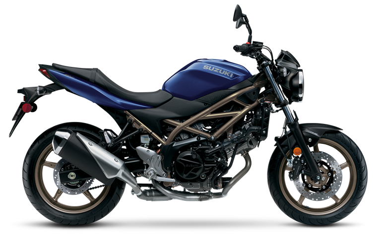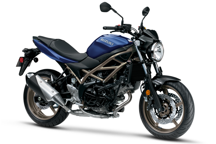 The 2023 SV650 ABS’s Metallic Reflective Blue bodywork is accompanied by a frame and wheels coated with dark-gold metallic paint.