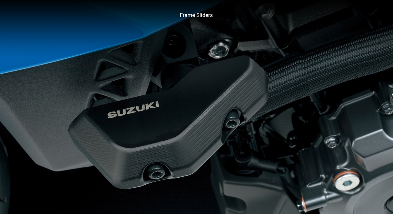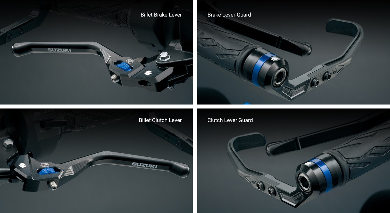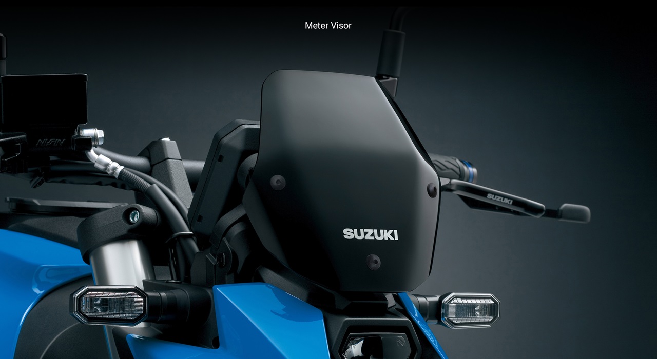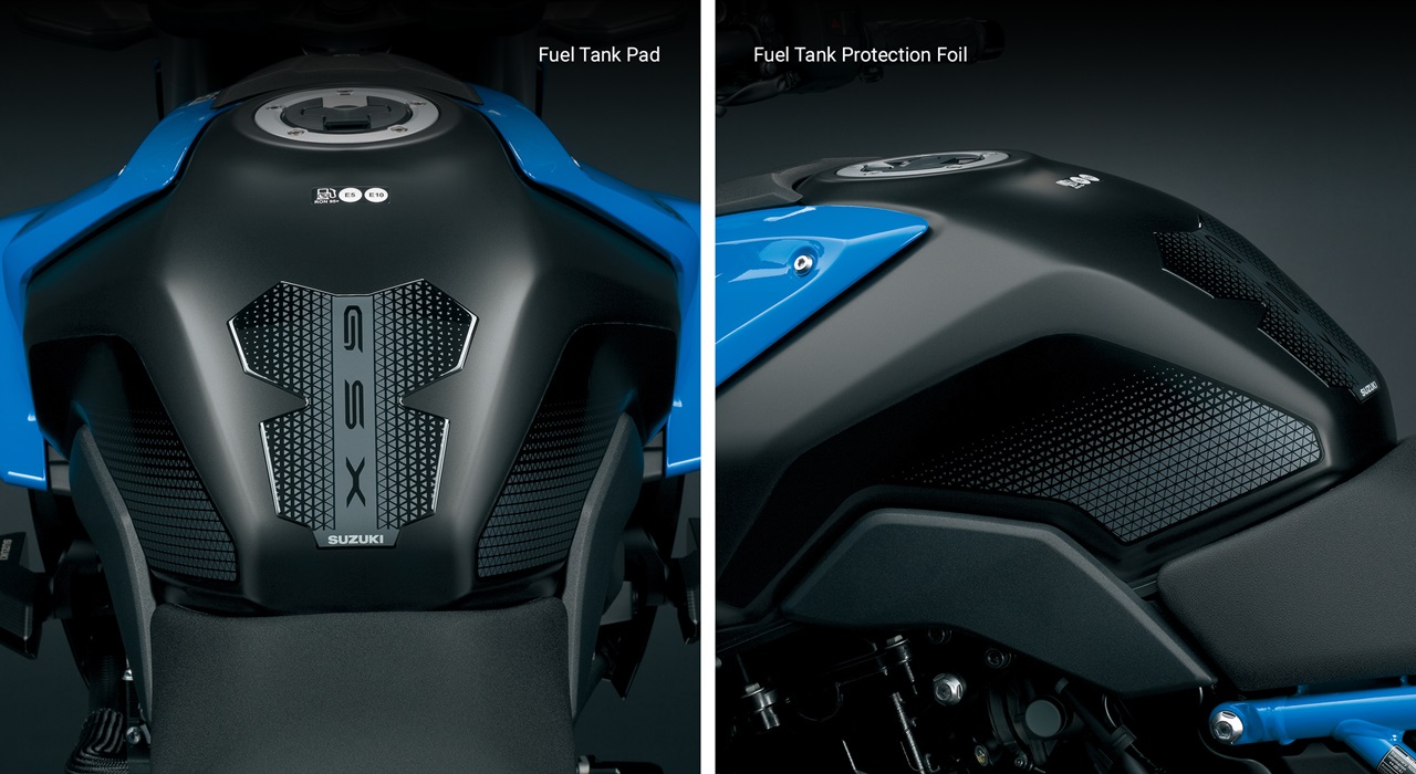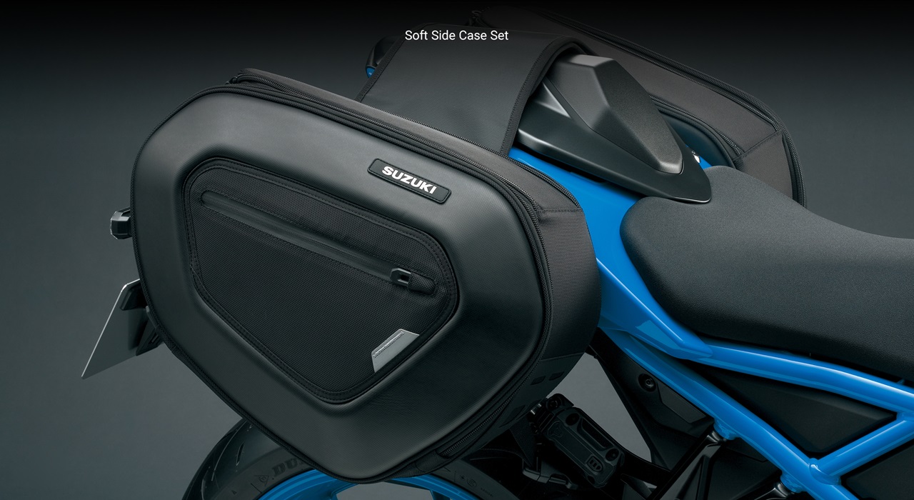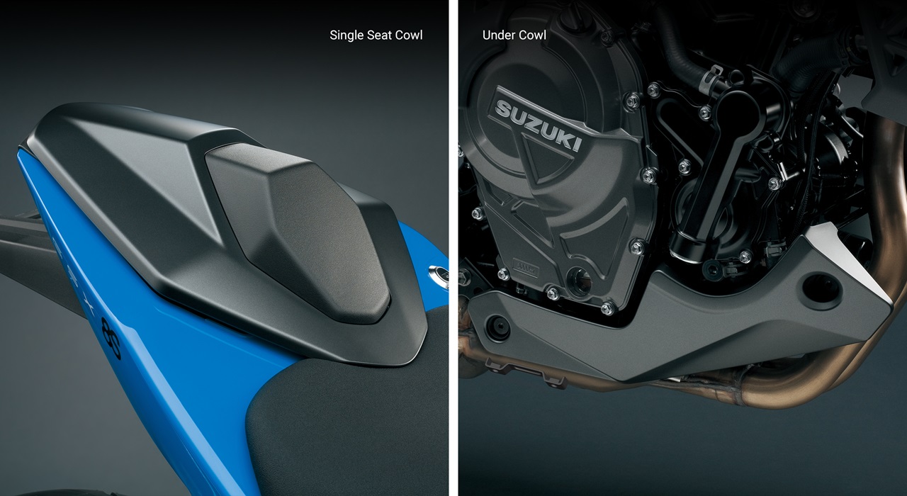 A variety of Genuine Suzuki Accessories are available for the GSX-8S, such as a solo seat cowl, meter visor (acting as a sport screen), billet clutch and brake levers, fuel tank, and engine cover protectors, clip-on tank bags, plus a selection of Suzuki logo apparel.